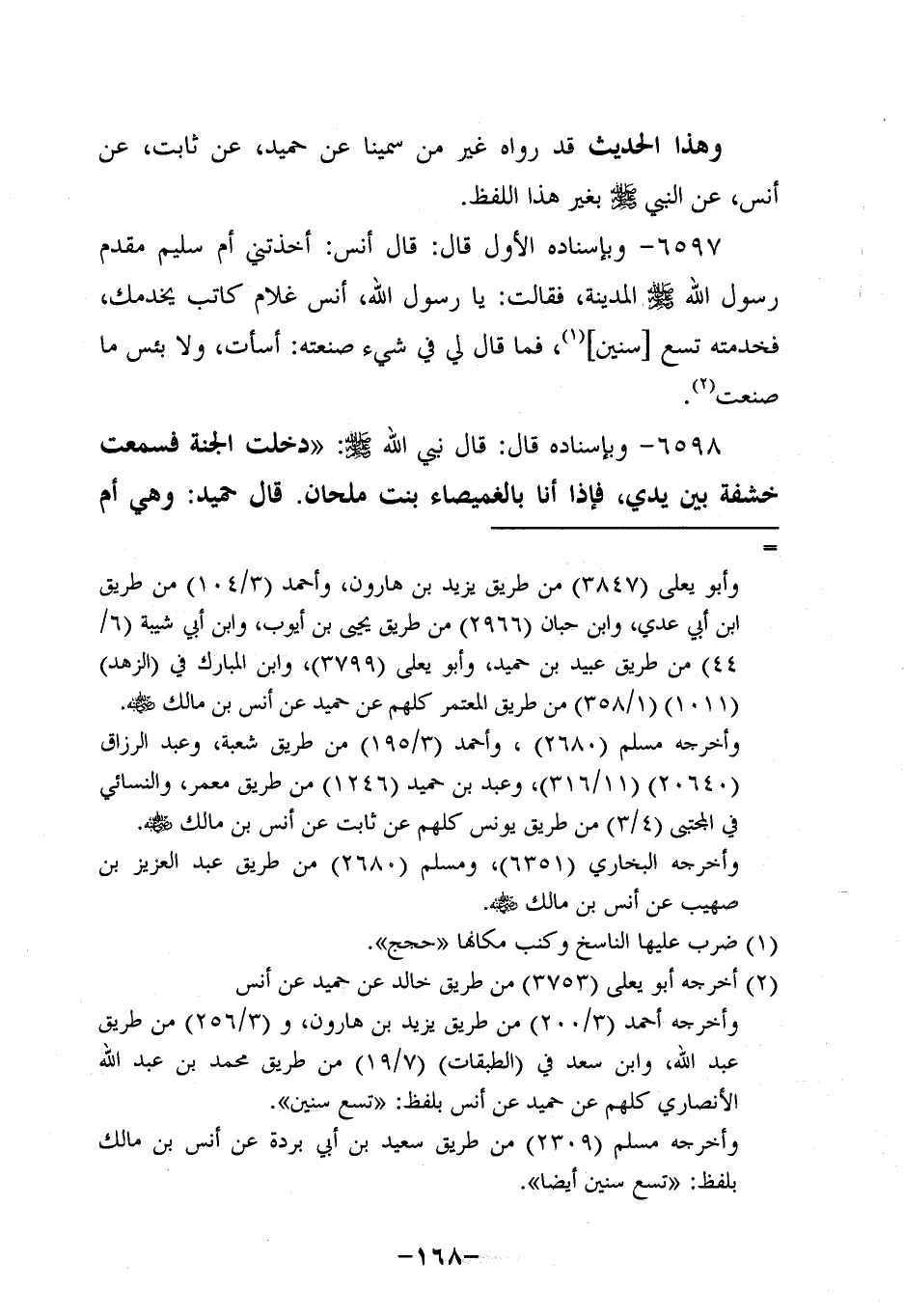 6598- وَبِإِسْنَادِهِ (1) ؛ قَالَ: قَالَ نَبِيُّ اللَّهِ صَلَّى اللَّهُ عَلَيْهِ وَسَلَّمَ: دَخَلْتُ الْجَنَّةَ فَسَمِعْتُ خَشْفَةً بَيْنَ يَدَيَّ، فَإِذَا أَنَا بِالْغُمَيْصَاءِ بِنْتِ مِلْحَانَ قَالَ حُمَيد: وَهِيَ أُمُّ سُلَيْمٍ.