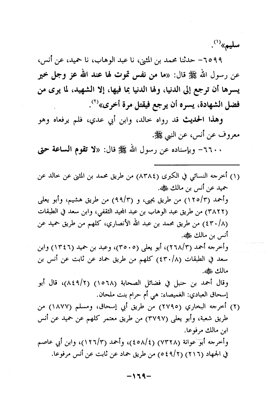 6599- حَدَّثنا محمد بن المثني، حَدَّثنا عَبد الوَهَّاب، حَدَّثنا حُمَيد، عَن أَنَس , عَنْ رَسُولِ اللَّهِ صَلَّى اللَّهُ عَلَيْهِ وَسَلَّمَ قَالَ: مَا مِنْ نَفْسٍ تَمُوتُ لَهَا عِنْدَ اللَّهِ عَزَّ وَجَلَّ خَيْرٌ يَسُرُّهَا أَنْ تَرْجِعَ إِلَى الدُّنْيَا وَلَهَا الدُّنْيَا بِمَا فِيهَا إلاَّ الشَّهِيدُ لِمَا يَرَى مِنْ فَضْلِ الشَّهَادَةِ يَسُرُّهُ أَنْ يَرْجِعَ فَيُقْتَلَ مَرَّةً أُخْرَى.