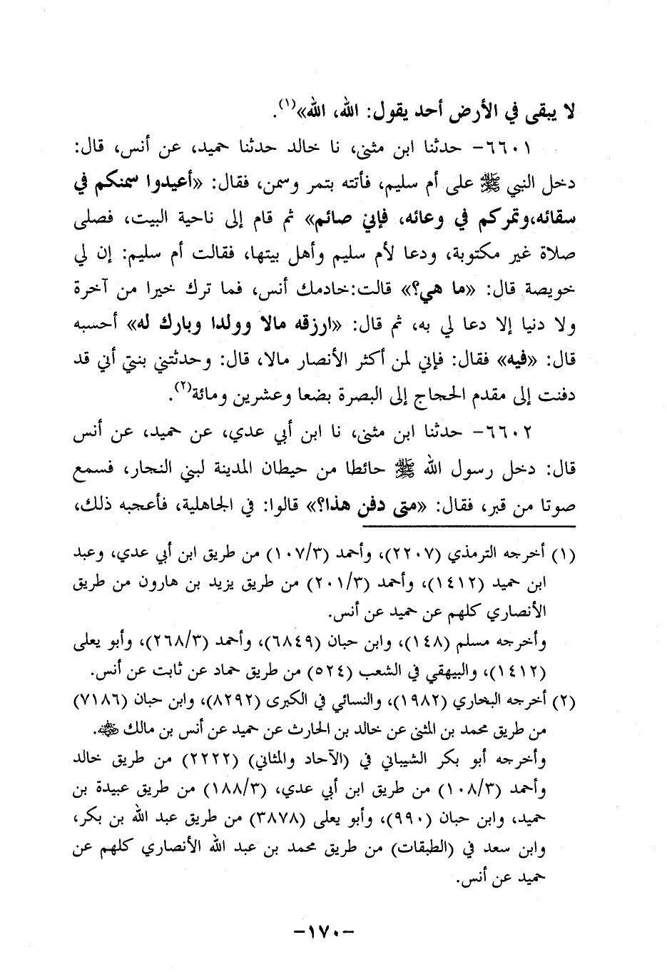 6602- حَدَّثنا ابن مُثَنَّى، حَدَّثنا ابْنُ أَبِي عَدِيّ , عَنْ حُمَيد، عَن أَنَسٍ، قَالَ: دَخَلَ رَسُولُ اللَّهِ صَلَّى اللَّهُ عَلَيْهِ وَسَلَّمَ حَائِطًا مِنْ حِيطَانِ الْمَدِينَةِ لِبَنِي النَّجَّارِ فَسَمِعَ صَوْتًا مِنْ قَبْرٍ فَقَالَ: مَتَى دُفِنَ هَذَا؟ قَالُوا: فِي الْجَاهِلِيَّةِ فَأَعْجَبَهُ ذَلِكَ، وَقال: لَوْلَا أَنْ لا تَدَافَنُوا لَدَعَوْتُ اللَّهَ تَبَارَكَ وَتَعَالَى أَنْ يُسْمِعَكُمْ عَذَابَ الْقَبْرِ.