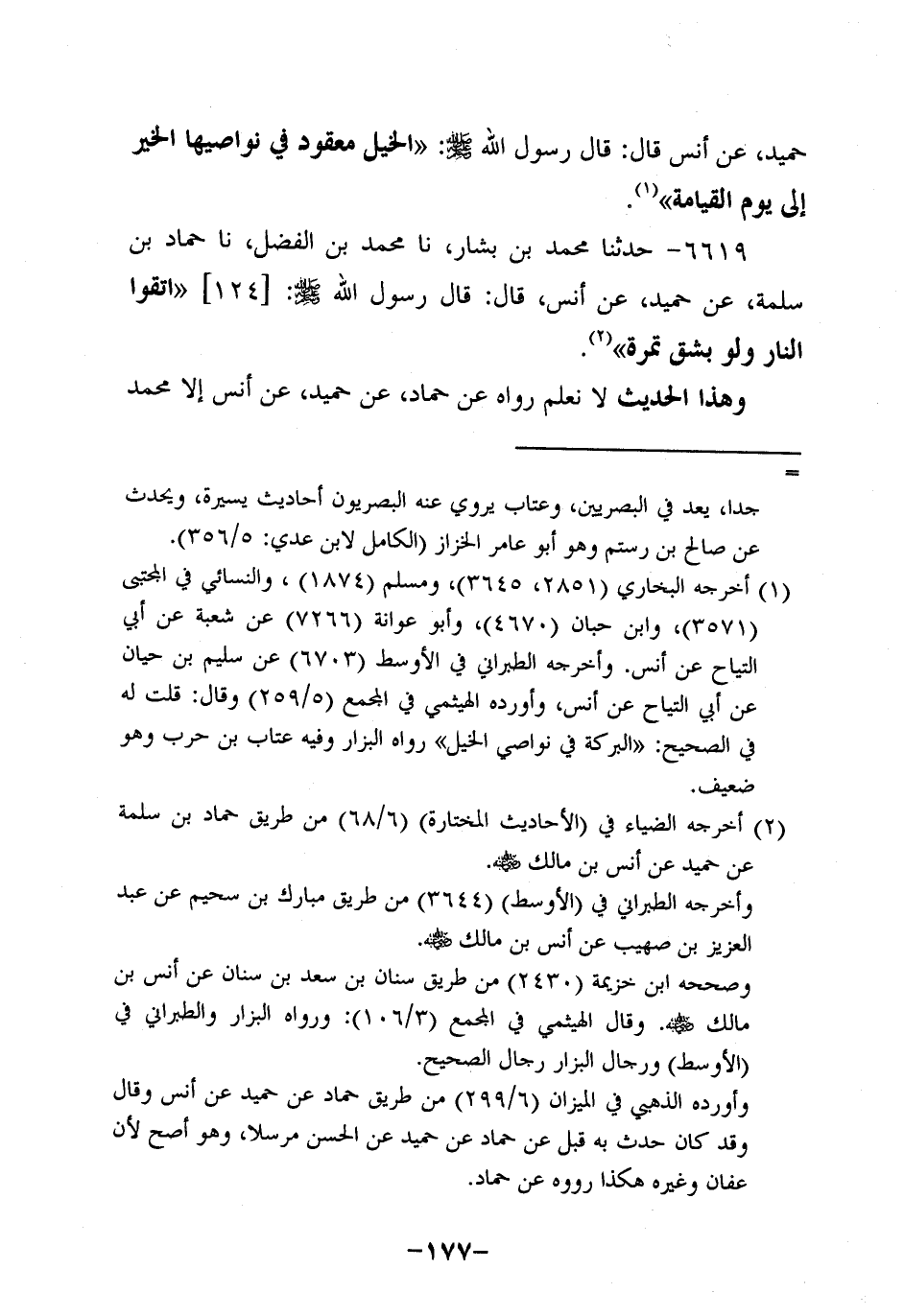 6619- حَدَّثنا محمد بن بشار، حَدَّثنا محمد بن الفضل، حَدَّثنا حَمَّادُ بْنُ سَلَمَةَ , عَنْ حُمَيد، عَن أَنَسٍ، قَالَ: قَالَ رَسُولُ اللَّهِ صَلَّى اللَّهُ عَلَيْهِ وَسَلَّمَ: اتَّقُوا النَّارَ، وَلَوْ بِشِقِّ تَمْرَةٍ.
