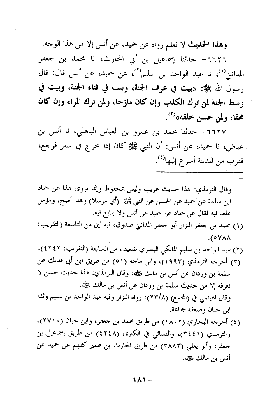 6626- حَدَّثنا إسماعيل بن أبي الحارث، حَدَّثنا محمد بن جعفر المدائني، حَدَّثنا عَبْدُ الْوَاحِدِ بْنُ سُلَيْمٍ , عَنْ حُمَيد، عَن أَنَسٍ، قَالَ: قَالَ رَسُولُ اللَّهِ صَلَّى اللَّهُ عَلَيْهِ وَسَلَّمَ: بَيْتٌ فِي عُرْفِ الْجَنَّةِ وَبَيْتٌ فِي فِنَاءِ الْجَنَّةِ وَبَيْتٌ فِي وَسَطِ الْجَنَّةِ لِمَنْ تَرَكَ الْكَذِبَ، وَإن كَانَ مَازِحًا وَلِمَنْ تَرَكَ الْمِرَاءَ، وَإن كَانَ مُحِقًّا وَلِمَنْ حَسُنَ خلقه.