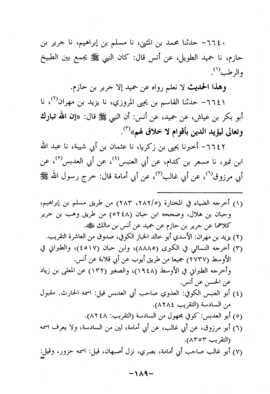 6641- حَدَّثنا القاسم بن يحيي المروزي، حَدَّثنا يزيد بن مهران، حَدَّثنا أَبُو بَكْرِ بْنُ عَيَّاشٍ , عَنْ حُمَيد، عَن أَنَس؛ أَنَّ النَّبِيّ صَلَّى اللَّهُ عَلَيْهِ وَسَلَّمَ قَالَ: إِنَّ اللَّهَ تَبَارَكَ وَتَعَالَى لَيُؤَيِّدُ الدِّينَ بِأَقْوَامٍ لَا خَلَاقَ لَهُمْ.