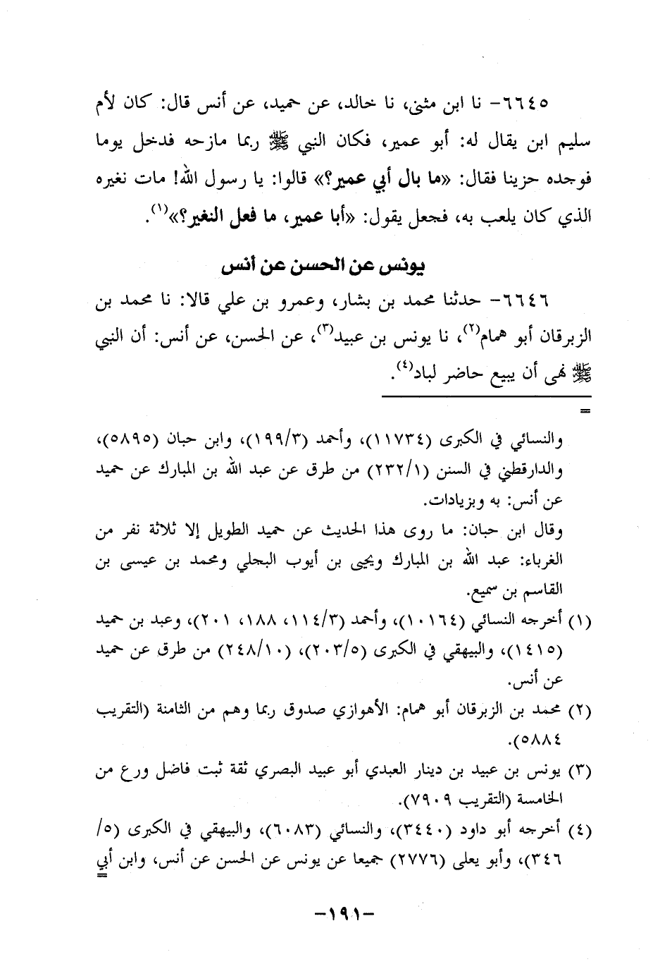 6646- حَدَّثنا مُحَمَّدُ بن بشار وعمرو بن علي، قالاَ: حَدَّثنا محمد بن الزبرقان أَبُو همام، حَدَّثنا يُونُس بْنُ عُبَيد , عَنِ الْحَسَنِ، عَن أَنَس؛ أَنَّ النَّبِيّ صَلَّى اللَّهُ عَلَيْهِ وَسَلَّمَ نَهَى أَنْ يَبِيعَ حَاضِرٌ لِبَادٍ.