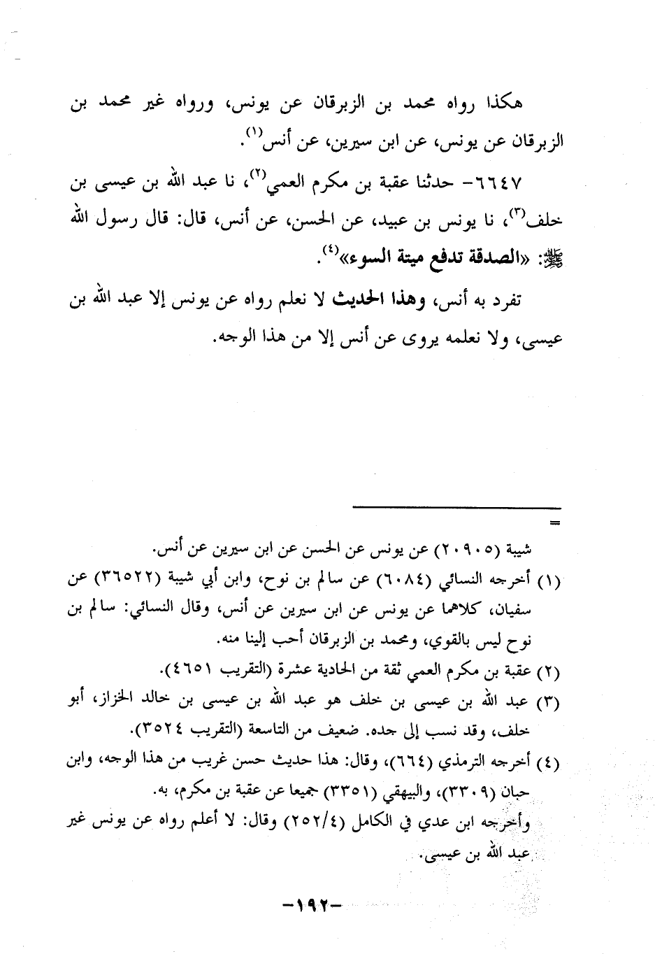 6647- حَدَّثنا عقبة بن مكرم العمي، حَدَّثنا عبد الله بن عيسي بن خلف، حَدَّثنا يُونُس بْنُ عُبَيد , عَنِ الْحَسَنِ، عَن أَنَسٍ، قَالَ: قَالَ رَسُولُ اللَّهِ صَلَّى اللَّهُ عَلَيْهِ وَسَلَّمَ: الصَّدَقَةُ تَدْفَعُ مَيْتَةَ السُّوءِ.
