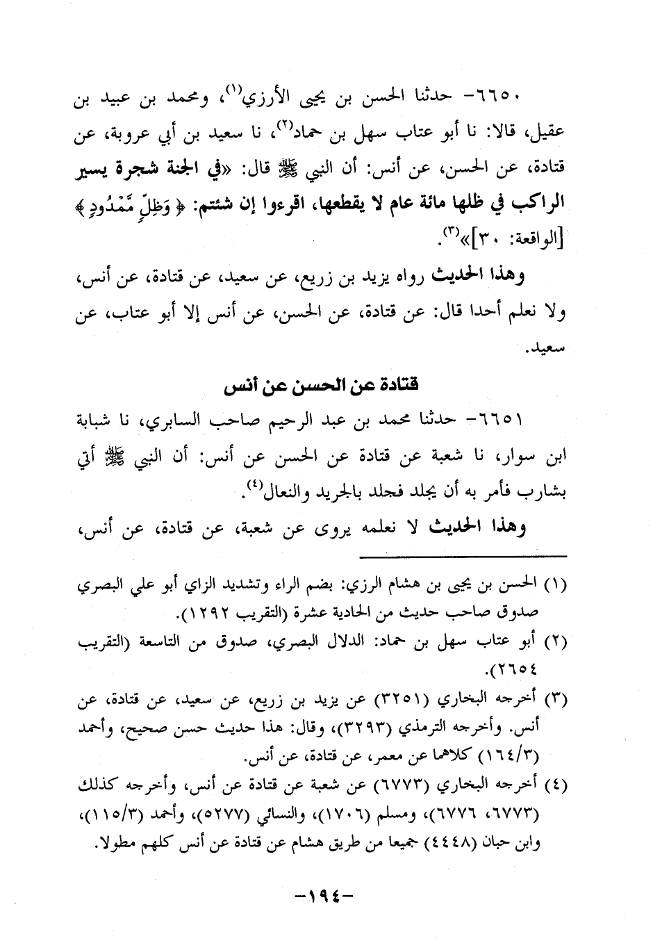 6650- حَدَّثنا الْحَسَنُ بْنُ يَحْيَى الأَرُزِّيُّ، ومُحَمد بن عُبَيد بن عَقِيل، قَالاَ: حَدَّثنَا أَبُو عتاب سهل بن حماد، حَدَّثنا سَعِيدِ بْنِ أَبِي عَرُوبة، عَن قَتادة , عَنِ الْحَسَنِ، عَن أَنَس؛ أَنَّ النَّبِيّ صَلَّى اللَّهُ عَلَيْهِ وَسَلَّمَ قَالَ: فِي الْجَنَّةِ شَجَرَةٌ يَسِيرُ الراكب في ظلها مِئَة عام لا يقطعها اقرؤُوا إن شئتم: {وظل ممدود} .