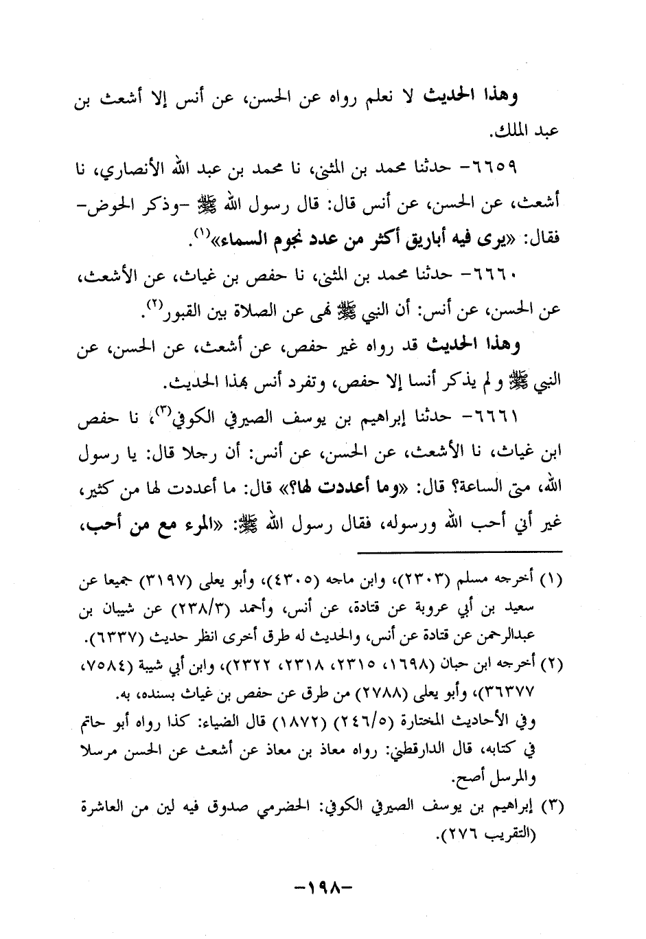 6659- حَدَّثنا مُحَمَّدُ بْنُ المثني، حَدَّثنا محمد بن عبد الله الأنصاري، حَدَّثنا أَشْعَثُ , عَنِ الْحَسَنِ , عَنْ أَنَسٍ قَالَ: قَالَ رَسُولِ اللَّهِ صَلَّى اللَّهُ عَلَيْهِ وَسَلَّمَ وَذَكَرَ الْحَوْضَ فَقَالَ: يُرَى فِيهِ أَبَارِيقُ أَكْثَرَ مِنْ عَدَدِ نُجُومِ السَّمَاءِ.