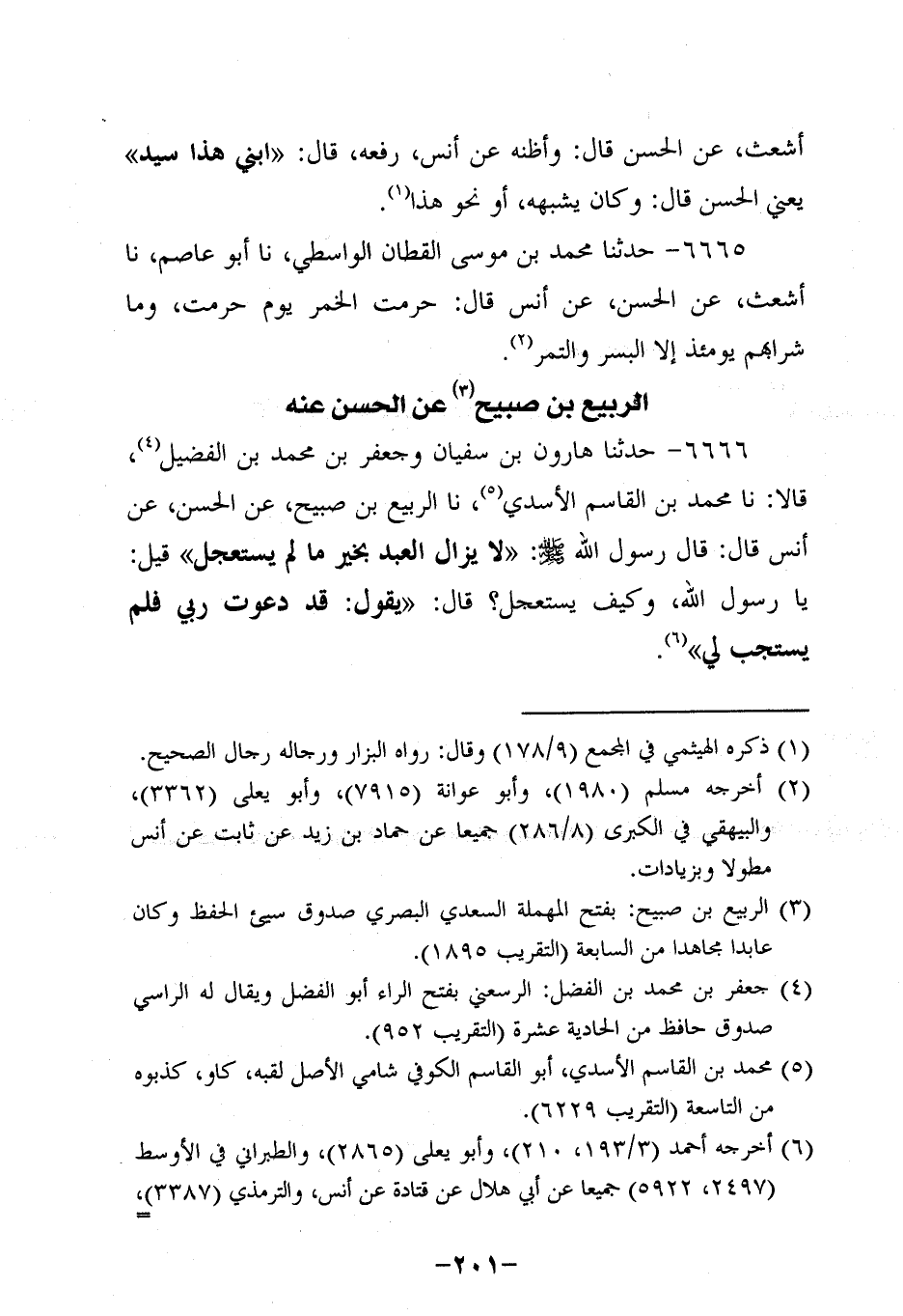 6666- حَدَّثنا هَارُونُ بْنُ سُفيان وَجَعْفَرُ بْنُ مُحَمَّدِ بْنِ الفضيل، قالاَ: حَدَّثنا محمد بن القاسم الأسدي، حَدَّثنا الرَّبِيعُ بْنُ صُبَيْحٍ , عَنِ الْحَسَنِ، عَن أَنَسٍ، قَالَ: قَالَ رَسُولُ اللَّهِ صَلَّى اللَّهُ عَلَيْهِ وَسَلَّمَ: لَا يَزَالُ الْعَبْدُ بِخَيْرٍ مَا لَمْ يَسْتَعْجِلْ قِيلَ: يَا رَسولَ اللهِ وَكَيْفَ يَسْتَعْجِلُ؟ قَالَ: يَقُولُ: قَدْ دَعَوْتُ رَبِّي فَلَمْ يَسْتَجِبْ لِي.