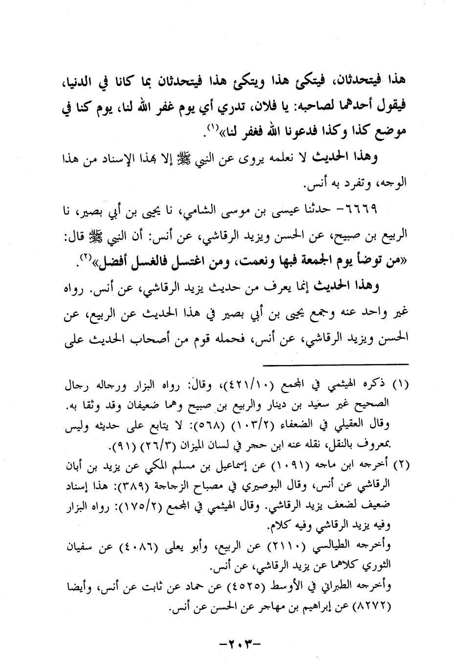 6669- حَدَّثنا عيسى بن موسى الشامي، حَدَّثنا يَحْيَى بن أبي بصير (1) ، حَدَّثنا الرَّبِيعُ بْنُ صُبَيْحٍ , عَنِ الْحَسَنِ وَيَزِيدَ الرَّقَاشِيِّ، عَن أَنَس؛ أَنَّ النَّبِيّ صَلَّى اللَّهُ عَلَيْهِ وَسَلَّمَ قَالَ: مَنْ تَوَضَّأَ يَوْمَ الْجُمُعَةِ فَبِهَا وَنِعْمَتْ، وَمَنْ اغْتَسَلَ فَالْغُسْلُ أَفْضَلُ.