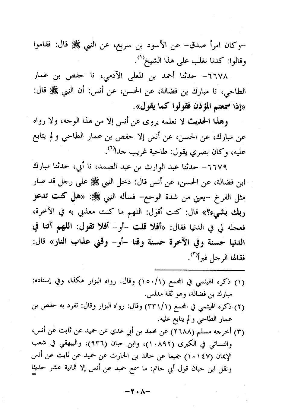 6679- حَدَّثنا عبد الوارث بن عبد الصمد، حَدَّثنا أَبِي، حَدَّثنا مُبَارَكُ بْنُ فَضَالَةَ , عَنِ الْحَسَنِ، عَن أَنَسٍ، قَالَ: دَخَلَ النَّبِيّ صَلَّى اللَّهُ عَلَيْهِ وَسَلَّمَ عَلَى رَجُلٍ قَدْ صَارَ مِثْلَ الْفَرْخِ، يَعْنِي مِنْ شِدَّةِ الْوَجَعِ فَسَأَلَهُ النَّبِيّ صَلَّى اللَّهُ عَلَيْهِ وَسَلَّمَ: هَلْ كُنْتَ تَدْعُو رَبَّكَ بِشَيْءٍ؟ قَالَ: كُنْتُ أَقُولُ: اللَّهُمَّ مَا كُنْتَ مُعَذِّبِي بِهِ فِي الآخِرَةِ فَعَجِّلْهُ لِي فِي الدُّنْيَا فَقَالَ: أَفَلا قُلْتَ، أَوْ أَفَلا تَقُولُ: اللَّهُمَّ آتِنَا فِي الدُّنْيَا حَسَنَةً وَفِي الآخِرَةِ حَسَنَةً وَقِنَا، أَوْ وَقِنِي عَذَابَ النَّارِ قَالَ: فَقَالَهَا الرَّجُلُ فَبَرَأَ.