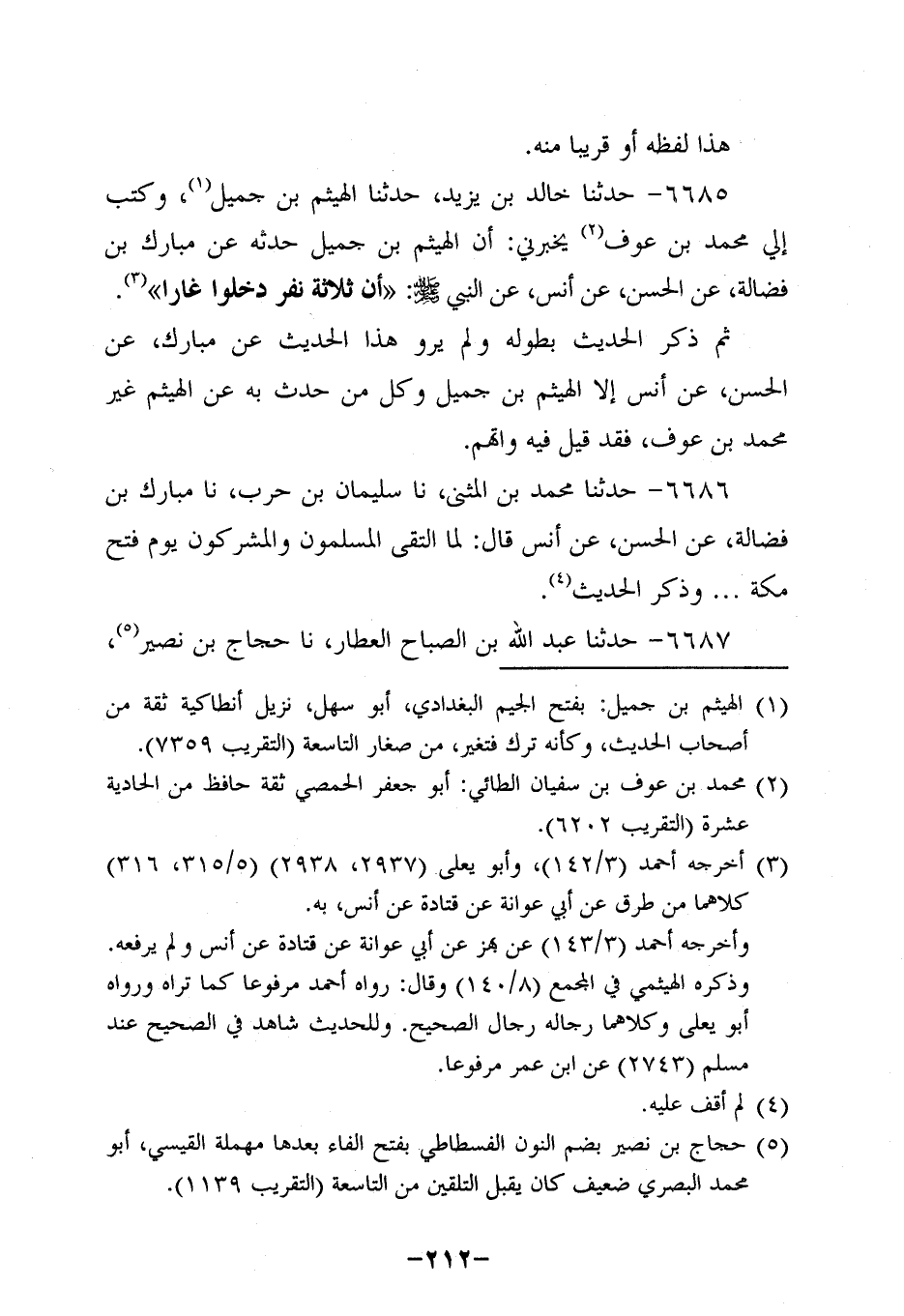 6685- حَدَّثنا خَالِدُ بْنُ يَزِيدَ، حَدَّثنا الْهَيْثَمُ بْنُ جَمِيلٍ وَكَتَبَ إِلَيَّ مُحَمَّدُ بْنُ عَوْفٍ , يُخْبِرُنِي أَنَّ الْهَيْثَمَ بْنَ جَمِيلٍ , حَدَّثَهُ عَنْ مُبَارَكِ بْنِ فَضَالَةَ , عَنِ الْحَسَنِ، عَن أَنَس، عَن النَّبِيّ صَلَّى اللَّهُ عَلَيْهِ وَسَلَّمَ: أَنَّ ثَلاثَةَ نَفَرٍ دَخَلُوا غَارًا.