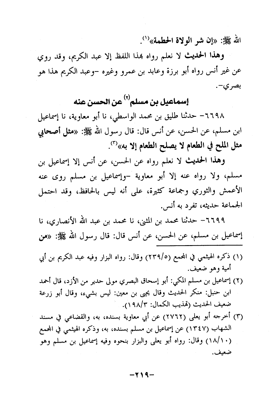 6698- حَدَّثنا طليق بن محمد الواسطي، حَدَّثنا أَبُو معاوية، حَدَّثنا إِسْمَاعِيلُ بْنُ مُسْلِمٍ , عَنِ الْحَسَنِ، عَن أَنَسٍ، قَالَ: قَالَ رَسُولُ اللَّهِ صَلَّى اللَّهُ عَلَيه وَسَلَّم: مَثَلُ أَصْحَابِي مَثَلُ الْمِلْحِ فِي الطَّعَامِ لَا يَصْلُحُ الطَّعَامُ إلاَّ بِهِ.