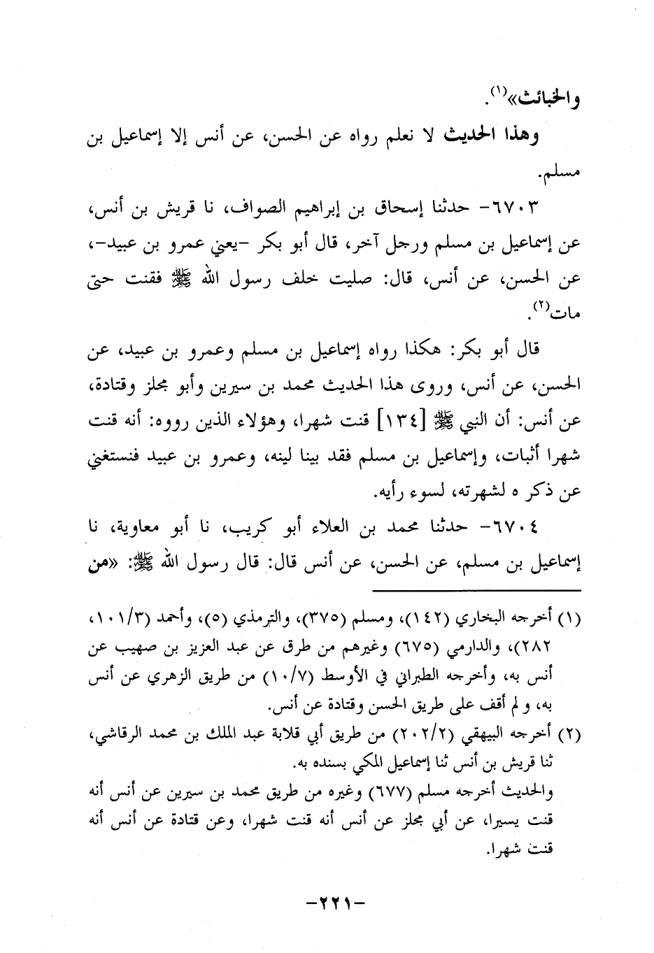 6703- حَدَّثنا إسحاق بن إبراهيم الصواف، حَدَّثنا قُرَيْشُ بْنُ أَنَسٍ , عَنْ إِسْمَاعِيلَ بْنِ مُسْلِمٍ وَرَجُلٍ آخَرَ قَالَ أَبُو بَكْرٍ، يَعني عَمْرو بْنُ عُبَيد - عَنِ الْحَسَنِ، عَن أَنَسٍ، قَالَ: صَلَّيْتُ خَلْفَ رَسُولِ اللَّهِ صَلَّى اللَّهُ عَلَيه وَسَلَّم فَقَنَتَ حَتَّى مَاتَ.