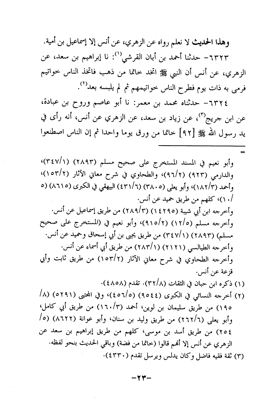 6324 - حدثناه محمد بن مَعْمَر، حَدَّثنا أَبُو عَاصِم روح بْنُ عُبَادَةَ، عَن ابْنِ جُرَيج , عَنْ زِيَادِ بْنِ سَعْدٍ، عَن الزُّهْرِيّ، عَن أَنَس؛ أَنَّه رَأَى فِي يَدِ رَسُولِ اللَّهِ صَلَّى اللَّهُ عَلَيْهِ وَسَلَّمَ خَاتَمًا مِنْ وَرِقٍ يَوْمًا وَاحِدًا، ثُمَّ إِنَّ النَّاسَ اصْطَنَعُوا الْخَوَاتِيمَ فَلَبِسُوهَا فَطَرَحَ النَّبِيّ صَلَّى اللَّهُ عَلَيْهِ وَسَلَّمَ خَاتَمَهُ فَطَرَحَ الناس خواتيمهم.