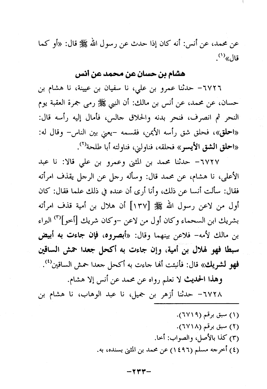6726- حَدَّثَنا عَمْرُو بْنُ عَلِيٍّ، حَدَّثنا سُفيان بن عُيَينة، حَدَّثنا هِشَامُ بْنُ حَسَّانٍ , عَنْ مُحَمَّدٍ، عَن أَنَس بْنِ مَالِكٍ: أَنَّ النَّبِيّ صَلَّى اللَّهُ عَلَيه وَسَلَّم رَمَى جَمْرَةَ الْعَقَبَةِ يَوْمَ النَّحْرِ، ثُمَّ انْصَرَفَ فَنَحَرَ بُدْنَهُ وَالْحَلَّاقُ جَالِسٌ فَأَمَالَ إِلَيْهِ رأسه قال: احلق , فحلق شق رأسه فَقَسَّمَهُ، يَعْنِي بَيْنَ النَّاسِ، وَقال لَهُ: احْلِقِ الشِّقَّ الأَيْسَرَ , فَحَلَقَهُ فَنَاوَلَنِي فَنَاوَلْتُهُ أَبَا طَلْحَةَ.