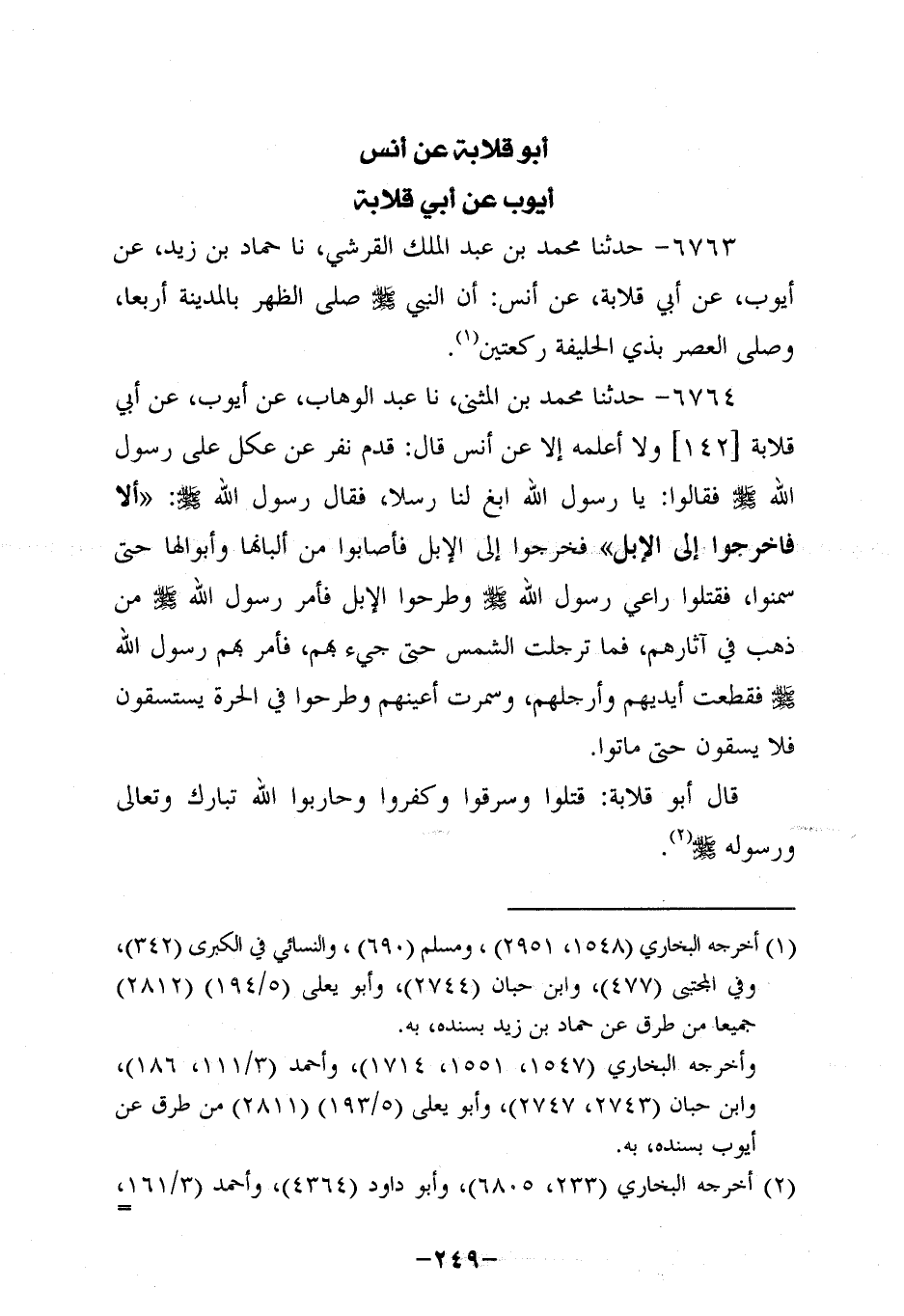 6764- حَدَّثنا مُحَمَّدُ بْنُ الْمُثَنَّى، حَدَّثنا عَبد الوَهَّاب , عَنْ أَيُّوبَ، عَن أَبِي قِلاَبَةَ، ولاَ أَعْلَمُهُ إلاَّ عَن أَنَسٍ، قَالَ: قَدِمَ نفر من عُكْلٍ عَلَى رَسُولِ اللَّهِ صَلَّى اللَّهُ عَلَيه وَسَلَّم فقالوا: يارسول اللَّهِ ابْغِ لَنَا رِسْلا فَقَالَ رَسُولُ اللَّهِ صَلَّى اللَّهُ عَلَيه وَسَلَّم: أَلَا فَاخْرُجُوا إِلَى الإِبِلِ فَخَرَجُوا إِلَى الإِبِلِ فَأَصَابُوا مِنْ أَلْبَانِهَا وَأَبْوَالِهَا حَتَّى سَمِنُوا فَقَتَلُوا رَاعِيَ رَسُولِ اللَّهِ صَلَّى اللَّهُ عَلَيه وَسَلَّم وَطَرَحُوا الإِبِلَ فَأَمَرَ رَسُولِ اللَّهِ صَلَّى اللَّهُ عَلَيه وَسَلَّم مِنْ ذَهَبَ فِي آثَارِهِمْ فَمَا تَرَجَّلَتِ الشَّمْسُ حَتَّى جِيءَ بِهِمْ فَأَمَرَ بِهِمْ رَسُولُ اللَّهِ صَلَّى اللَّهُ عَلَيه وَسَلَّم فَقُطِّعَتْ أَيْدِيهِمْ وَأَرْجُلُهُمْ وَسُمِرَتْ أَعْيُنُهُمْ وَطُرِحُوا فِي الْحَرَّةِ يَسْتَسْقُونَ فَلا يُسْقَوْنَ حَتَّى مَاتُوا.