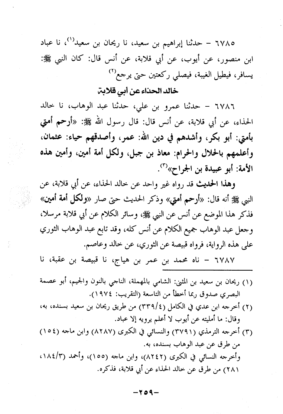6786- حَدَّثَنا عَمْرُو بْنُ عَلِيٍّ، حَدَّثنا عَبد الوَهَّاب، حَدَّثنا خَالِدٌ الحَذَّاء، عَن أَبِي قِلاَبَةَ، عَن أَنَسٍ، قَالَ: قَالَ رَسُولُ اللَّهِ صَلَّى اللَّهُ عَلَيه وَسَلَّم: أَرْحَمُ أُمَّتِي بِأُمَّتِي: أَبُو بَكْرٍ وَأَشَدُّهُمْ فِي دِينِ اللَّهِ: عُمَر، وَأَصْدَقُهُمْ حَيَاءً: عُثمَان، وَأَعْلَمُهُمْ بِالْحَلالِ وَالْحَرَامِ: مُعَاذُ بْنُ جَبَلٍ وَلِكُلِّ أُمَّةٍ أَمِينٌ وَأَمِينُ هَذِهِ الأُمَّةِ: أَبُو عُبَيْدَةَ بن الْجَرَّاحِ.