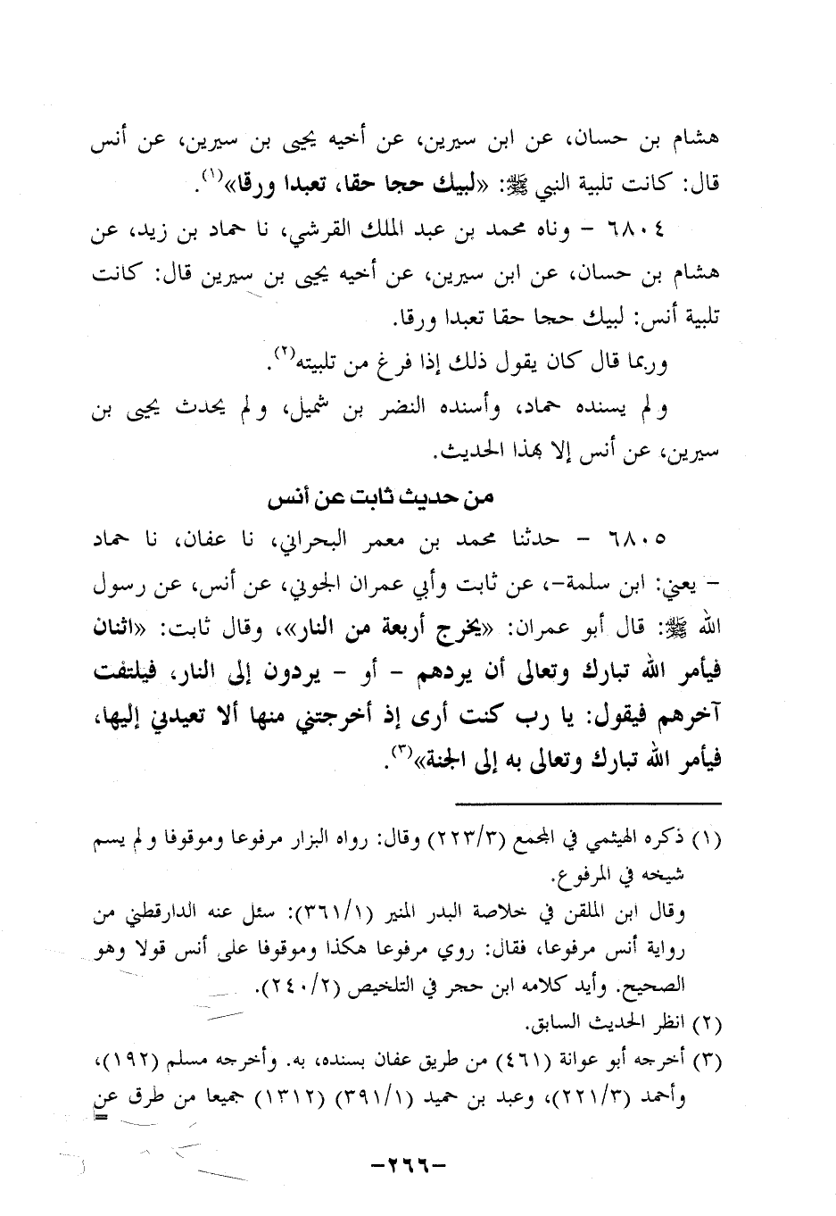 6804- وحَدَّثناه محمد بن عبد الملك القرشي، حَدَّثنا حَمَّادُ بْنُ زَيْدٍ , عَنْ هِشَامِ بْنِ حَسَّانٍ، عَن ابن سيرين , عن أخيه يَحْيَى بن سِيرِينَ قَالَ: كَانَتْ تَلْبِيَةُ أَنَسٍ: لَبَّيْكَ حَجًّا حَقًّا تَعَبُّدًا وَرِقًّا.