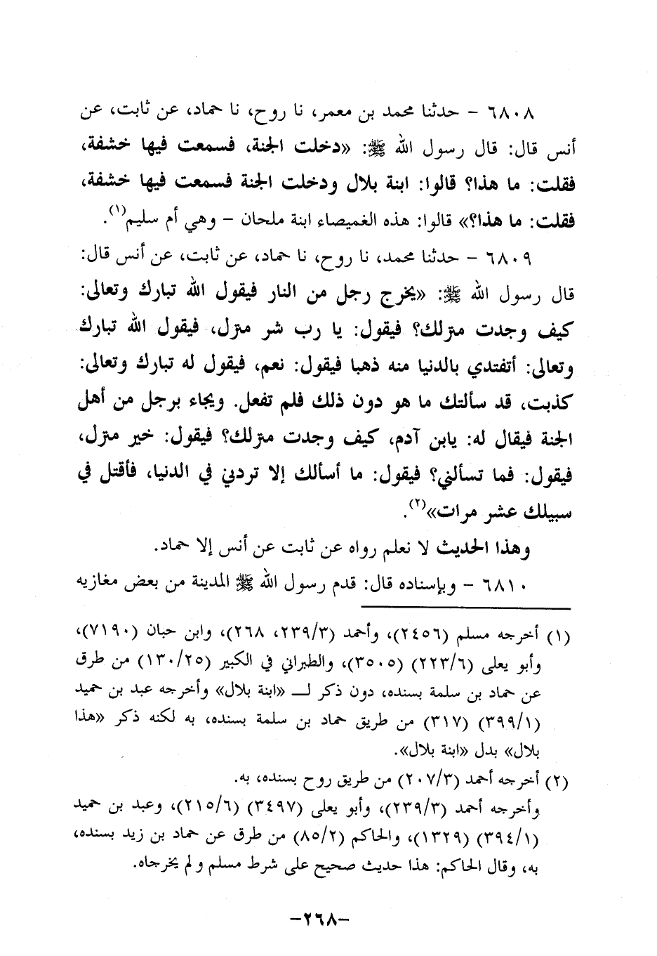 6808- حَدَّثنا محمد بن مَعْمَر، حَدَّثنا روح، حَدَّثنا حَمَّادٌ، عَنْ ثابتٍ، عَن أَنَسٍ، قَالَ: قَالَ رَسُولُ اللَّهِ صَلَّى اللَّهُ عَلَيه وَسَلَّم: دَخَلْتُ الْجَنَّةَ فَسَمِعْتُ فِيهَا خَشْفَةً فَقُلْتُ: مَا هَذَا؟ قَالُوا: ابْنَةُ بِلالٍ وَدَخَلْتُ الْجَنَّةَ فَسَمِعْتُ فِيهَا خَشْفَةً فَقُلْتُ: مَا هَذَا؟ قَالُوا: هَذِهِ الْغُمَيْصَاءُ ابْنَةُ مِلْحَانَ وَهِيَ أُمُّ سُلَيْمٍ.