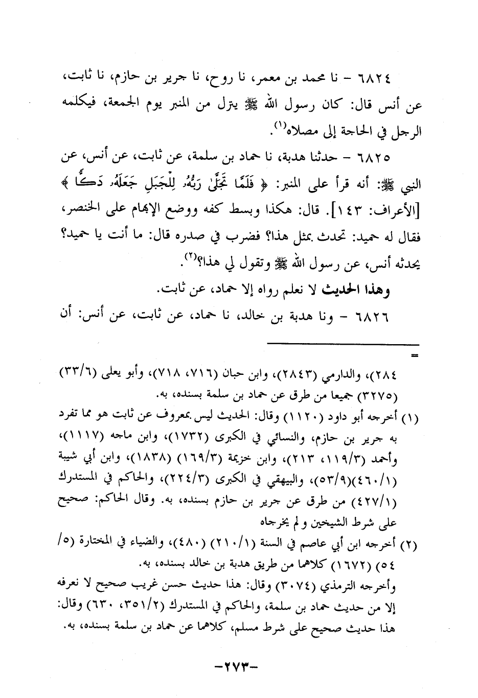 6825- حَدَّثنا هدبة، حَدَّثنا حَمَّادِ بْنِ سَلَمَةَ، عَنْ ثابتٍ، عَن أَنَس، عَن النَّبِيّ صَلَّى اللَّهُ عَلَيه وَسَلَّم؛ أَنَّه قَرَأَ عَلَى الْمِنْبَرِ: {فَلَمَّا تَجَلَّى رَبُّهُ لِلْجَبَلِ جعله دكا} قَالَ: هَكَذَا وَبَسَطَ كَفَّهُ وَوَضَعَ الإِبْهَامَ عَلَى الْخِنْصِرِ فَقَالَ لَهُ حُمَيد: تُحَدِّثُ بِمِثْلِ هَذَا؟ فضرب في صدره قال: ما أنت ياحميد؟ يُحَدِّثُهُ أَنَسٌ عَنْ رَسُولِ اللَّهِ صَلَّى اللَّهُ عَلَيه وَسَلَّم وَتَقُولُ لِي هَذَا؟.