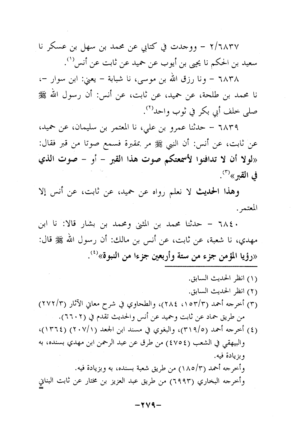 6839- حَدَّثَنا عَمْرُو بْنُ عَلِيٍّ، حَدَّثنا الْمُعْتَمِرُ بْنُ سُلَيْمَانَ , عَنْ حُمَيد، عَنْ ثابتٍ، عَن أَنَس؛ أَن النَّبِيّ صَلَّى اللَّهُ عَلَيه وَسَلَّم مَرَّ بِمَقْبَرَةٍ، فَسَمِعَ صَوتًا مِنْ قَبْرٍ، فَقَالَ: لَوْلَا أَنْ لَا تَدَافَنُوا، لأَسْمَعْتُكُمْ صَوْتَ هَذَا الْقَبْرِ، أَوْ صَوْتَ الَّذِي فِي الْقَبْرِ.