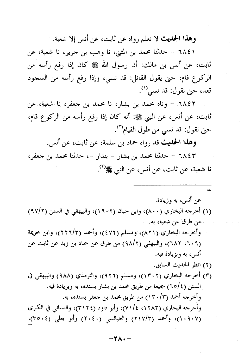 6841- حَدَّثنا محمد بن المثنى، حَدَّثنا وهب بن جرير، حَدَّثنا شُعْبَةُ، عَنْ ثابتٍ، عَن أَنَس بْنِ مَالِكٍ: أَنَّ رَسُولَ اللهِ صَلَّى اللَّهُ عَلَيه وَسَلَّم كَانَ إِذَا رَفَعَ رَأْسَهُ مِنَ الرُّكُوعِ قَامَ حتى يقول القائل: قد نسي، وإذا رفع رأسه من السجود قعد حتى يقول: قد نسي.