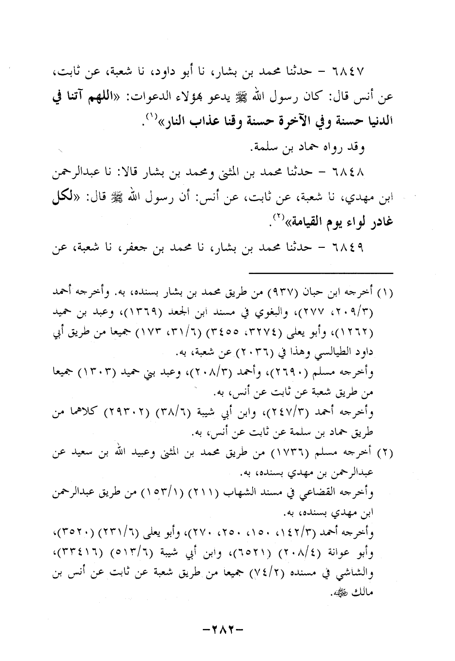 6847- حَدَّثنا محمد بن بشار، حَدَّثنا أَبُو داود، حَدَّثنا شُعْبَةُ، عَنْ ثابتٍ، عَن أَنَسٍ، قَالَ: كَانَ رَسُولُ اللَّهِ صَلَّى اللَّهُ عَلَيه وَسَلَّم يَدْعُو بِهَؤُلاءِ الدَّعَوَاتِ: اللَّهُمَّ آتِنَا فِي الدُّنْيَا حَسَنَةً وَفِي الآخِرَةِ حَسَنَةٌ وَقِنَا عَذَابَ النَّارِ.