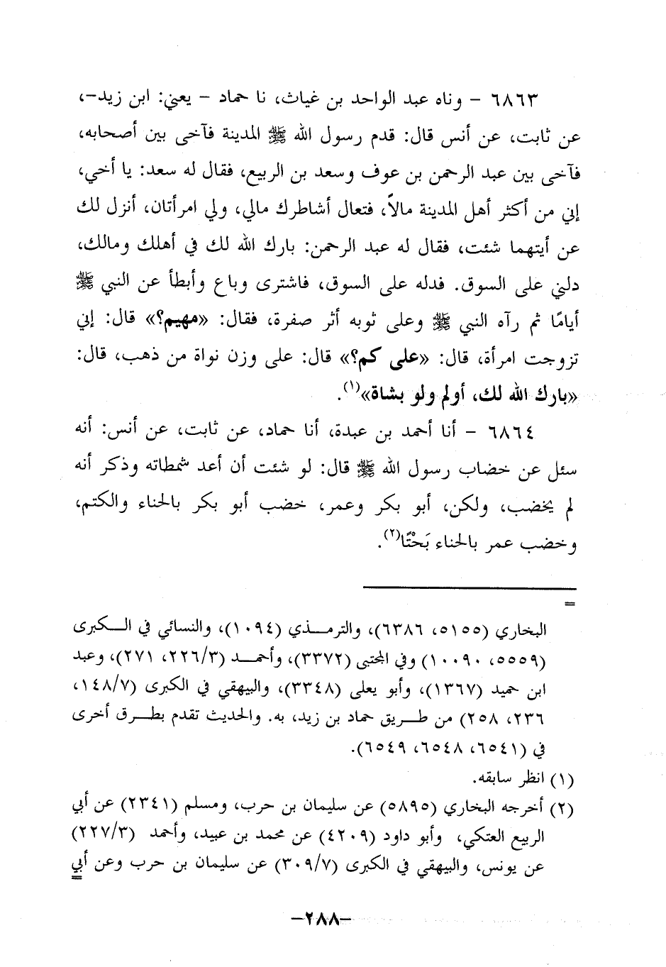 6863- وحَدَّثناه عبد الواحد بن غياث، حَدَّثنا حَمَّادٌ، يَعْنِي ابْنَ زَيْدٍ، عَنْ ثابتٍ، عَن أَنَسٍ، قَالَ: قَدِمَ رَسُولُ اللَّهِ صَلَّى اللَّهُ عَلَيه وَسَلَّم الْمَدِينَةَ فَآخَى بَيْنَ أَصْحَابِهِ فَآخَى بَيْنَ عَبْدِ الرَّحْمَنِ بْنِ عَوْفٍ وَسَعْدِ بْنِ الربيع فقال له سعد: ياأخي إِنِّي مِنْ أَكْثَرِ أَهْلِ الْمَدِينَةِ مَالًا فَتَعَالَ أُشَاطِرُكَ مَالِي وَلِي امْرَأَتَانِ أَنْزِلُ لَكَ عَنْ أَيَّتِهِمَا شِئْتَ فَقَالَ لَهُ عَبْدُ الرَّحْمَنِ: بَارَكَ اللَّهُ لَكَ فِي أَهْلِكَ وَمَالِكَ دُلَّنِي عَلَى السُّوقِ فَدَلَّهُ عَلَى السُّوقِ فَاشْتَرَى وَبَاعَ وَأَبْطَأَ، عَن النَّبِيّ صَلَّى اللَّهُ عَلَيه وَسَلَّم أَيَّامًا، ثُمَّ رَآهُ النَّبِيّ صَلَّى اللَّهُ عَلَيه وَسَلَّم وعلى ثوبه صُفْرَةٍ فَقَالَ: مَهْيَمَ؟ قَالَ: إِنِّي تَزَوَّجْتُ امْرَأَةً قَالَ: عَلَى كَمْ؟ قَالَ: عَلَى وَزْنِ نَوَاةٍ مِنْ ذَهَبٍ قَالَ: بَارَكَ اللَّهُ لَكَ أَوْلِمْ، ولو بشاة.