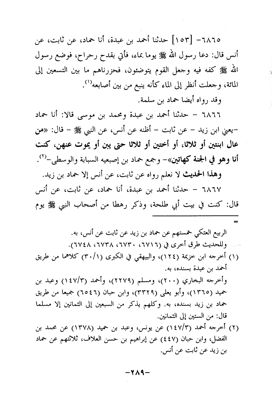 6866- حَدَّثنا أَحْمَدُ بْنُ عَبْدَةَ، ومُحَمد بْنُ مُوسَى قالا: أخبرنا حَمَّادٌ، يَعْنِي ابْنَ زَيْدٍ، عَنْ ثابتٍ أَظُنُّهُ، عَن أَنَس، عَن النَّبِيّ صَلَّى اللَّهُ عَلَيه وَسَلَّم قَالَ: مَنْ عَالَ ابْنَتَيْنِ، أَوْ ثَلاثًا، أَوْ أُخْتَيْنِ، أَوْ ثَلاثًا حَتَّى يَبْنِ، أَوْ يَمُوتَ عَنْهُنَّ كُنْتُ أَنَا، وهُو فِي الْجَنَّةِ كَهَاتَيْنِ وَجَمَعَ حَمَّادُ بَيْنَ إِصْبَعَيْهِ السَّبَّابَةِ وَالْوُسْطَى.