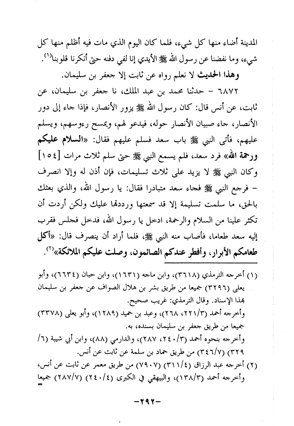 6872- حَدَّثنا محمد بن عبد الملك، حَدَّثنا جَعْفَرُ بْنُ سُلَيْمَانَ، عَنْ ثابتٍ، عَن أَنَسٍ، قَالَ: كَانَ رَسُولُ اللَّهِ صَلَّى اللَّهُ عَلَيه وَسَلَّم يَزُورُ الأَنْصَارَ، فَإِذَا جَاءَ إِلَى دُورِ الأنصار جاء صبيان حوله فيدعو لهم ويمسح رؤُوسهم وَيُسَلِّمُ عَلَيْهِمْ فَأَتَى النَّبِيّ صَلَّى اللَّهُ عَلَيه وَسَلَّم بَابَ سَعْدٍ فَسَلَّمَ عَلَيْهِمْ فَقَالَ: السَّلامُ عَلَيْكُمْ وَرَحْمَةُ اللَّهِ فَرَدَّ سَعْدٌ فَلَمْ يَسْمَعِ النَّبِيّ صَلَّى اللَّهُ عَلَيه وَسَلَّم حَتَّى سَلَّمَ ثَلاثَ مَرَّاتٍ، وَكان النَّبِيّ صَلَّى اللَّهُ عَلَيه وَسَلَّم لَا يَزِيدُ عَلَى ثَلاثِ تَسْلِيمَاتٍ فَإِنْ أُذِنَ لَهُ وَإِلَّا انْصَرَفَ فَرَجَعَ النَّبِيّ صَلَّى اللَّهُ عَلَيه وَسَلَّم فَجَاءَ سَعْدٌ مُتَبَادِرًا فَقَالَ: يارسول اللَّهِ وَالَّذِي بَعَثَكَ بِالْحَقِّ مَا سَلَّمْتَ تَسْلِيمَةً إلاَّ قَدْ سَمِعْتُهَا وَرَدَدْتُهَا عَلَيْكَ، وَلكن أَرَدْتُ أَنْ تُكْثِرَ عَلَيْنَا مِنَ السَّلامِ وَالرَّحْمَةِ ادْخُلْ يارسول اللَّهِ فَدَخَلَ، فَجَلَسَ فَقَرَّبَ إِلَيْهِ سَعْدٌ طَعَامًا فَأَصَابَ مِنْهُ النَّبِيّ صَلَّى اللَّهُ عَلَيه وَسَلَّم فَلَمَّا أَرَادَ أَنْ يَنْصَرِفَ قَالَ: أَكَلَ طَعَامُكُمُ الأَبْرَارُ وَأَفْطَرَ عِنْدَكُمُ الصَّائِمُونَ وَصَلَّتْ عَلَيْكُمُ الْمَلائِكَةُ.