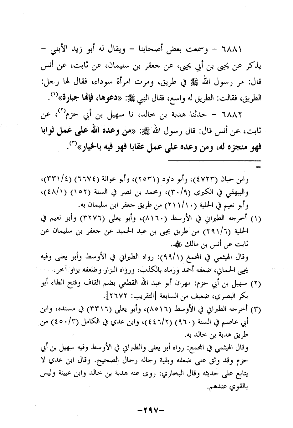 6881- وَسَمِعْتُ بَعْضَ أَصْحَابِنَا -، ويُقَال لَهُ أَبُو زَيْدٍ الأُبُلِّيُّ يَذْكُرُ، عَن يَحْيَى بْنِ أَبِي يَحْيَى عَنْ جَعْفَرِ بْنِ سُلَيْمَانَ، عَنْ ثابتٍ، عَن أَنَسٍ، قَالَ: مَرَّ رَسُولُ اللَّهِ صَلَّى اللَّهُ عَلَيه وَسَلَّم فِي طَرِيقٍ وَمَرَّتِ امْرَأَةٌ سَوْدَاءُ فَقَالَ لَهَا رَجُلٌ: الطَّرِيقَ فَقَالَتِ: الطَّرِيقُ لَهُ وَاسِعٌ فَقَالَ النَّبِيّ صَلَّى اللَّهُ عَلَيه وَسَلَّم: دَعُوهَا فَإِنَّهَا جَبَّارَةٌ.