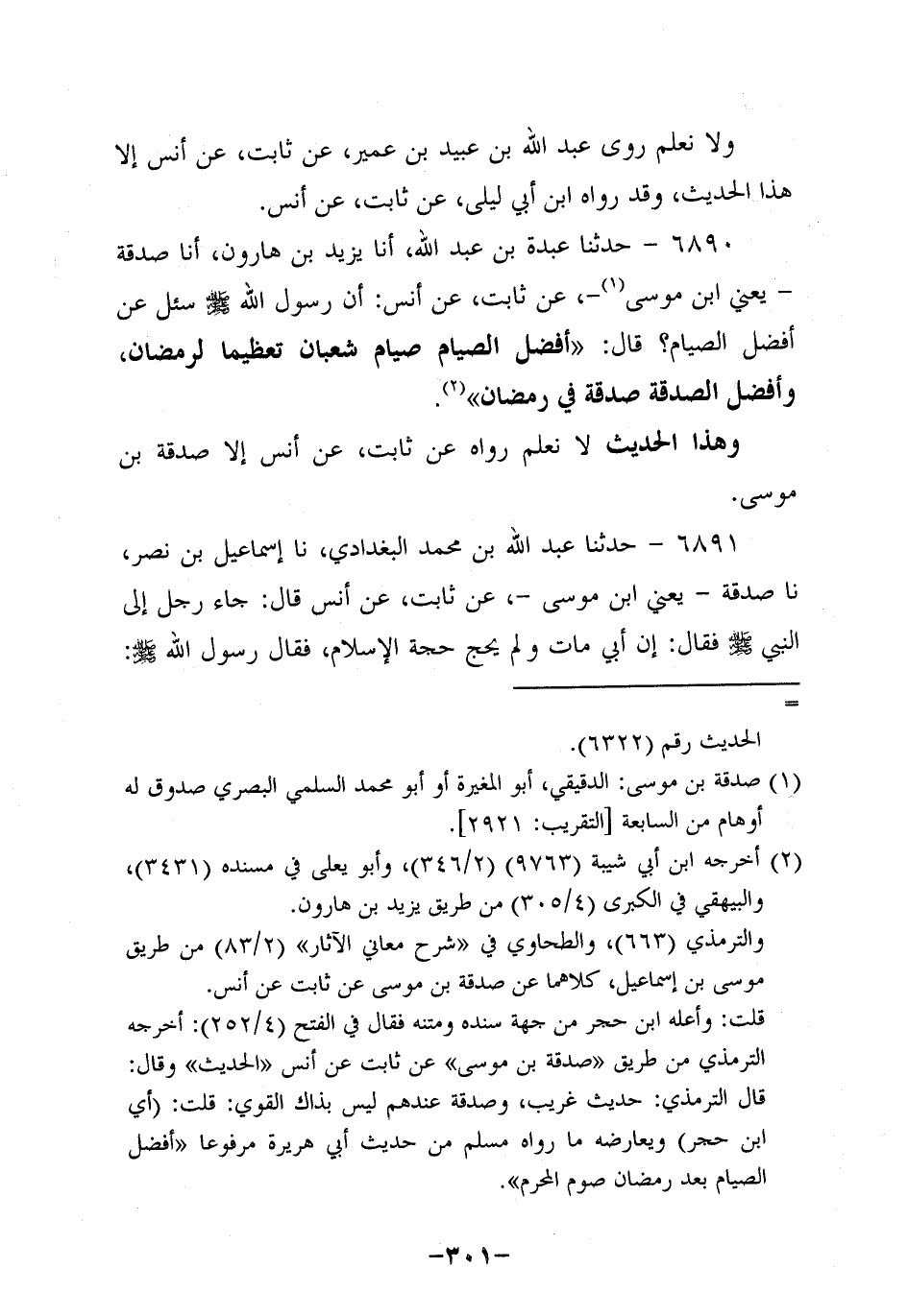 6890- حَدَّثنا عبدة بن عبد الله , أخبرنا يزيد بن هارون , أخبرنا صَدَقَةُ، يَعْنِي ابْنَ مُوسَى، عَنْ ثابتٍ، عَن أَنَس؛ أَن رَسولَ اللهِ صَلَّى اللَّهُ عَلَيه وَسَلَّم سُئِلَ عَنْ أَفْضَلِ الصِّيَامِ؟ قَالَ: أَفْضَلُ الصِّيَامِ صِيَامُ شَعْبَانَ تَعْظِيمًا لِرَمَضَانَ وَأَفْضَلُ الصَّدَقَةِ صَدَقَةٌ فِي رَمَضَانَ.