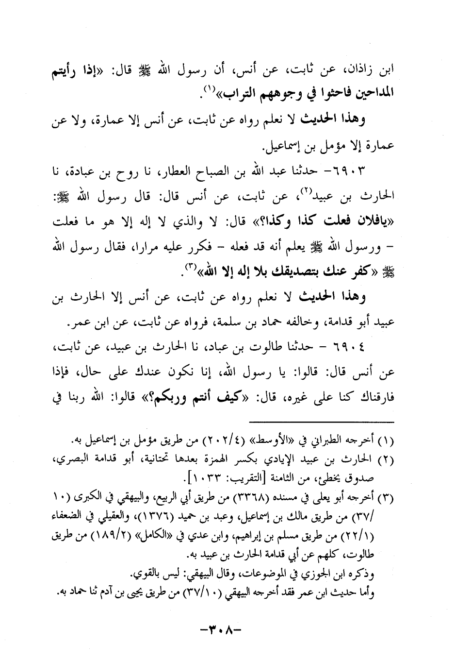 6904- حَدَّثنا طالوت بن عباد، حَدَّثنا الْحَارِثُ بْنُ عُبَيد، عَنْ ثابتٍ، عَن أَنَسٍ، قال: قالوا: يارسول اللَّهِ إِنَّا نَكُونُ عِنْدَكَ عَلَى حَالٍ، فَإِذَا فَارَقْنَاكَ كُنَّا عَلَى غَيْرِهِ قَالَ: كَيْفَ أَنْتُمْ وَرَبُّكُمْ؟ قَالُوا: اللَّهُ رَبُّنَا فِي السِّرِّ وَالْعَلانِيَةِ قَالَ: لَيْسَ ذَلِكُمُ النِّفَاقَ.