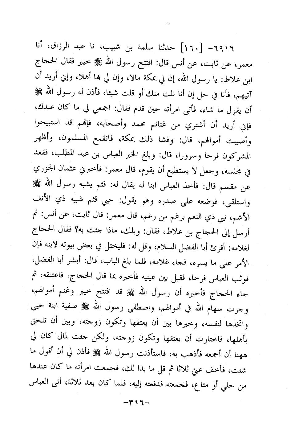 قَالَ مَعْمَرٌ: قَالَ ثَابِتٌ، عَن أَنَس: ثُمَّ أَرْسَلَ إِلَى الْحَجَّاجِ بْنِ عِلاطٍ، فَقَالَ: وَيْلَكَ، ماذا جئتَ به؟ فقال الحجاج لغلامه: أقرىء أَبَا الْفَضْلِ السَّلامَ، وَقُلْ لَهُ: فليخْتَلِ فِي بَعْضِ بُيُوتِهِ لابْنِهِ، فَإِنَّ الأمرَ عَلَى مَا يَسُرُّهُ، فَجَاءَ غلامُهُ، فَلَمَّا بَلَغَ البابَ، قَالَ: أَبْشِرْ أَبَا الْفَضْلِ، فَوَثَبَ الْعَبَّاسُ فَرَحًا، فَقَبَّل بين عينيه، فأخبره بما قال الحجاج، فأَعتَقَهُ، ثُمَّ جَاءَ الحجاجُ، فَأَخْبَرَهُ أَنَّ رسولَ اللَّهِ صَلَّى اللَّهُ عَلَيه وَسَلَّم قَدِ افْتَتَحَ خيبرَ , وغنِمَ أَمْوَالَهُمْ , وَجَرَتْ سِهامُ اللَّهِ فِي أَمْوَالِهِمْ , وَاصْطَفَى رسولُ اللَّهِ صَلَّى اللَّهُ عَلَيه وَسَلَّم صَفِيََّة ابْنَةَ حُيَيٍّ، وَاتَّخَذَهَا لِنَفْسِهِ , وخيَّرَها بَيْنَ أَنْ يُعْتِقَهَا، وَتَكُونَ زَوْجَتَهُ , وَبَيْنَ أَنْ تَلْحَقَ بأهلها , فاختارت أن يعتقها وتكون زوجته , ولكني جئتُ لمالٍ كان لي هاهنا، أَنْ أَجْمَعَهُ فَأَذْهَبُ بِهِ , فاستأذنتُ رسولَ اللَّهِ صَلَّى اللَّهُ عَلَيه وَسَلَّم، فَأَذِنَ لِي أَنْ أقولَ مَا شئتُ , فَأَخْفِ عَنِّي ثَلاثًا، ثُمَّ قُلْ مَا بَدَا لَكَ , فجَمَعَتِ امرأتُهُ مَا كَانَ عِنْدَهَا مِنْ حُلي، أَوْ متاعٍ , فجَمَعَتْهُ، فدفَعَتْهُ إليه.