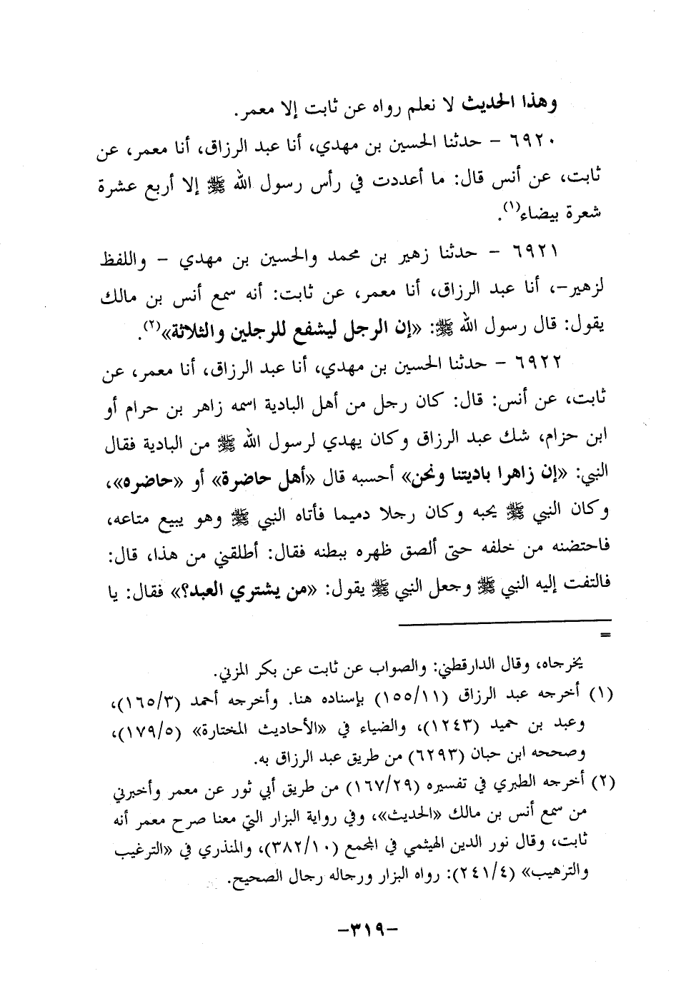 6921- حَدَّثنا زُهَيْرُ بْنُ مُحَمَّدٍ وَالْحُسَيْنُ بْنُ مَهْدِيٍّ واللفظ لزهير , أخبرنا عبد الرَّزَّاق , أخبرنا مَعْمَر، عَنْ ثابتٍ: أَنَّهُ سَمِعَ أَنَسَ بْنَ مَالِكٍ يَقُولُ: قَالَ رَسُولُ اللَّهِ صَلَّى اللَّهُ عَلَيه وَسَلَّم: إِنَّ الرَّجُلَ لَيَشْفَعُ لِلرَّجُلَيْنِ وَالثَّلاثَةِ.