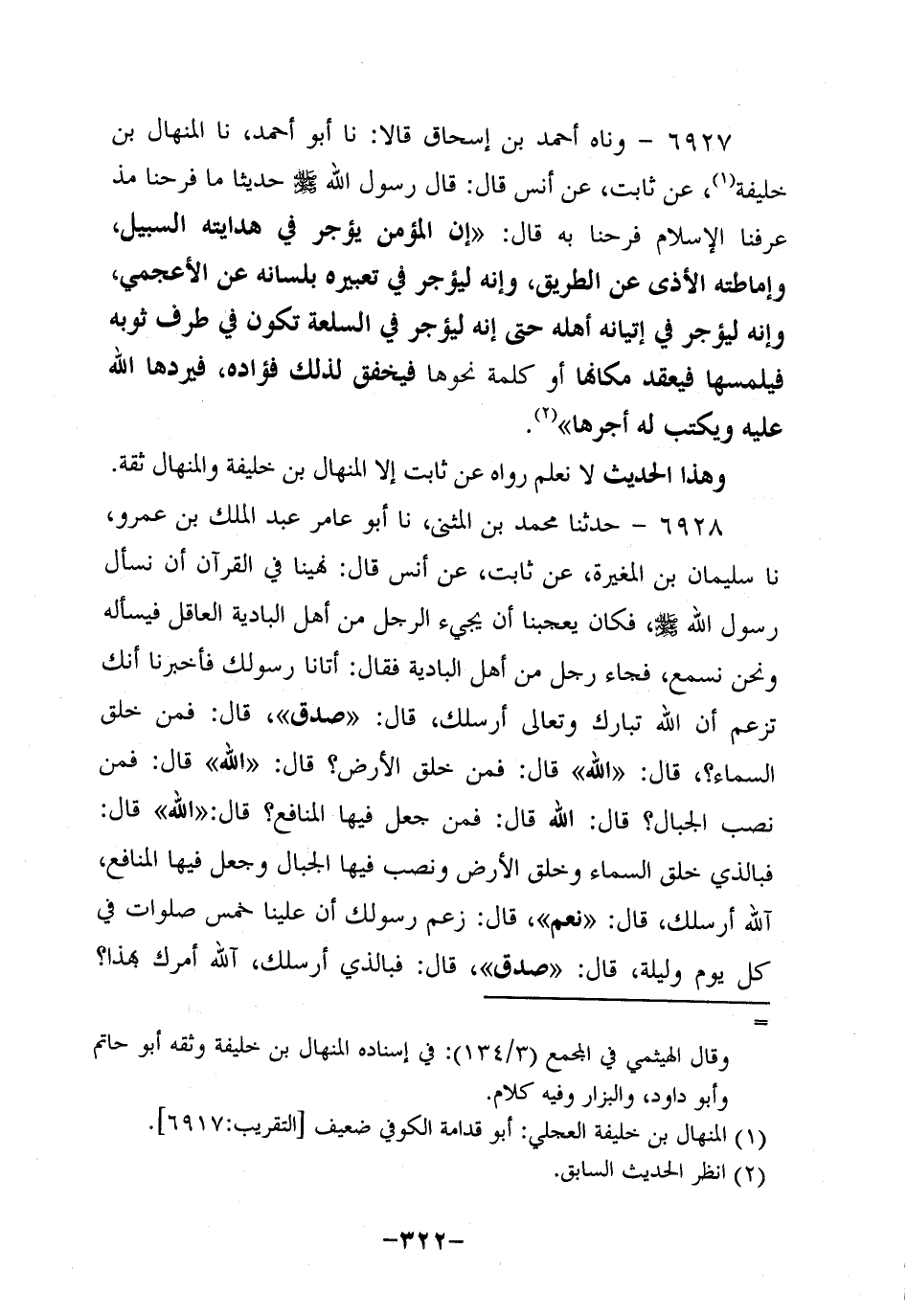 6927- وحَدَّثناه أحمد بن إسحاق، قَالاَ: حَدَّثنَا أَبُو أحمد، حَدَّثنا الْمِنْهَالُ بْنُ خَلِيفَةَ، عَنْ ثابتٍ، عَن أَنَسٍ، قَالَ: قَالَ رَسُولُ اللَّهِ صَلَّى اللَّهُ عَلَيه وَسَلَّم حَدِيثًا مَا فَرِحْنَا مُذْ عَرَفْنَا الإِسْلامَ فَرِحْنَا بِهِ قَالَ: إِنَّ الْمُؤْمِنَ يُؤْجَرُ فِي هِدَايَتِهِ السَّبِيلَ وَإِمَاطَتِهِ الأَذَى عَنِ الطَّرِيقِ وَإِنَّهُ لَيُؤْجَرُ فِي تَعْبِيرِهِ بِلِسَانِهِ عَنِ الأَعْجَمِيِّ وَإِنَّهُ لَيُؤْجَرُ فِي إِتْيَانِهِ أَهْلَهُ حَتَّى إِنَّهُ لَيُؤْجَرُ فِي السِّلْعَةِ تَكُونُ فِي طَرَفِ ثَوْبِهِ فَيَلْمِسُّهَا فَيَعْقِدُ مَكَانَهَا -أَوْ كَلِمَةً نَحْوَهَا- فَيَخْفِقُ لِذَلِكَ فُؤَادُهُ فَيَرُدُّهَا اللَّهُ عَلَيْهِ وَيَكْتُبُ لَهُ أَجْرَهَا.