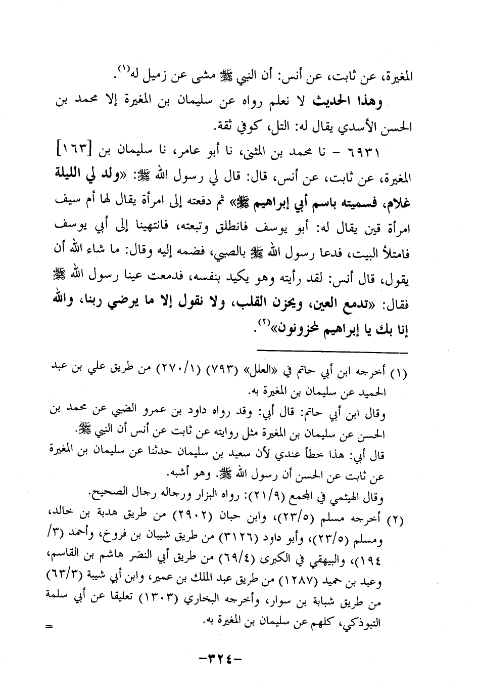 6931- حَدَّثنا محمد بن المثنى، حَدَّثنا أَبُو عامر، حَدَّثنا سُلَيْمَانُ بْنُ الْمُغِيرَةِ، عَنْ ثابتٍ، عَن أَنَسٍ، قَالَ: قَالَ لِي رَسُولُ اللَّهِ صَلَّى اللَّهُ عَلَيه وَسَلَّم: وُلِدَ لِي اللَّيْلَةَ غُلامٌ فَسَمَّيْتُهُ بِاسْمِ أَبِي إِبْرَاهِيمَ صَلَّى اللَّهُ عَلَيه وَسَلَّم، ثُمَّ دَفَعْتُهُ إِلَى امْرَأَةٍ يُقَالُ لَهَا أُمُّ سَيْفٍ امْرَأَة قَيْنٍ يُقَالُ لَهُ: أَبُو يُوسُفَ فَانْطَلَقَ وَتَبِعَتُهُ فَانْتَهَيْنَا إِلَى أَبِي يُوسُفَ فَامْتَلَأَ البيت فدعا رسول الله صلى الله بِالصَّبِيِّ فَضَمَّهُ إِلَيْهِ، وَقال: مَا شَاءَ اللَّهُ أَنْ يَقُولَ، قَالَ أَنَسٌ: لَقَدْ رَأَيْتُهُ، وهُو يَكِيدُ بِنَفْسِهِ فَدَمَعَتْ عَيْنَا رَسُولِ اللَّهِ صَلَّى اللَّهُ عَلَيه وَسَلَّم فَقَالَ: تَدْمَعُ الْعَيْنُ وَيَحْزَنُ الْقَلْبُ، ولاَ نَقُولُ إلاَّ مَا يُرْضِي رَبَّنَا والله إنا بك ياإبراهيم لَمَحْزُونُونَ.
