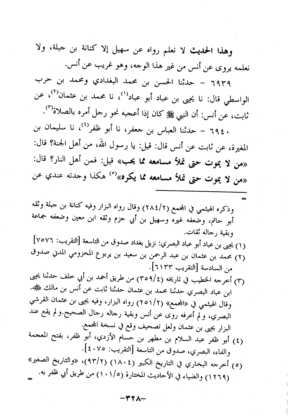 6940- حَدَّثنا العباس بن جعفر، حَدَّثنا أَبُو ظفر، حَدَّثنا سُلَيْمَانُ بْنُ الْمُغِيرَةِ، عَنْ ثابتٍ، عَن أَنَسٍ، قال: قيل: يارسول اللَّهِ مَنْ أَهْلُ الْجَنَّةِ؟ قَالَ: مَنْ لَا يَمُوتُ حَتَّى تُمْلَأَ مَسَامِعُهُ مِمَّا يُحِبُّ قِيلَ فَمَنْ أَهْلُ النَّارِ؟ قَالَ: مَنْ لَا يَمُوتُ حَتَّى تُمْلَأَ مَسَامِعُهُ مِمَّا يَكْرَهُ.