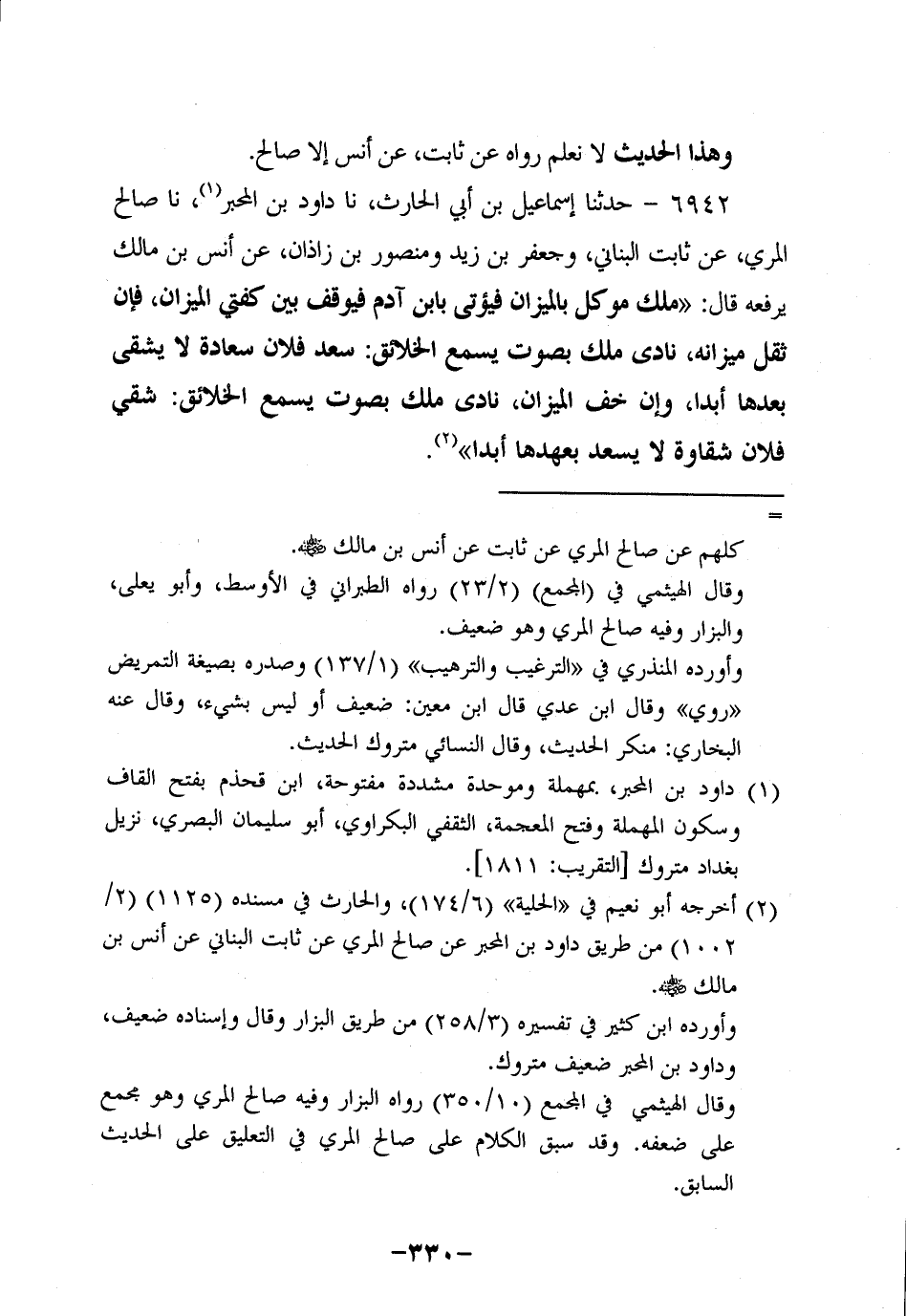 6942- حَدَّثنا إِسْمَاعِيلُ بْنُ أَبِي الْحَارِثِ، حَدَّثنا دَاوُدُ بن المحبر، حَدَّثنا صَالِحٌ الْمُرِّيُّ، عَنْ ثابتٍ الْبُنَانِيِّ وَجَعْفَرِ بْنِ زَيْدٍ وَمَنْصُورِ بْنِ زَاذَانَ، عَن أَنَس بْنِ مَالِكٍ يَرْفَعُهُ قَالَ: مَلَكٌ مُوَكَّلٌ بِالْمِيزَانِ فَيُؤْتَى بِابْنِ آدَمَ فَيُوَقَّفُ بَيْنَ كِفَّتَيِ الْمِيزَانِ فَإِنْ ثَقُلَ مِيزَانُهُ نَادَى مَلَكٌ بِصَوْتٍ يُسَمِّعُ الْخَلائِقَ: سَعِدَ فُلانٌ سَعَادَةً لا يَشْقَى بَعْدَهَا أَبَدًا، وَإن خَفَّ الْمِيزَانُ نَادَى مَلَكٌ بِصَوْتٍ يُسَمِّعُ الْخَلائِقَ: شَقِيَ فُلانٌ شَقَاوَةً لا يَسْعَدُ بَعْدَهَا أَبَدًا.