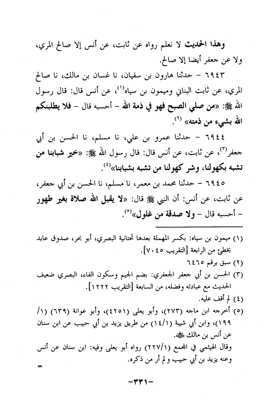 6943- حَدَّثنا هارون بن سُفيان، حَدَّثنا غسان بن مالك، حَدَّثنا صَالِحٌ الْمُرِّيُّ، عَنْ ثابتٍ الْبُنَانِيِّ وَمَيْمُونِ بْنِ سِيَاهٍ، عَن أَنَسٍ، قَالَ:قَالَ رَسُولُ اللَّهِ صَلَّى اللَّهُ عَلَيه وَسَلَّم: مَنْ صَلَّى الصُّبْحَ فَهُوَ فِي ذِمَّةِ اللَّهِ، أَحسَبُهُ قَالَ - فَلا يَطْلُبَنَّكُمُ اللَّهُ بِشَيْءٍ مِنْ ذِمَّتِهِ.