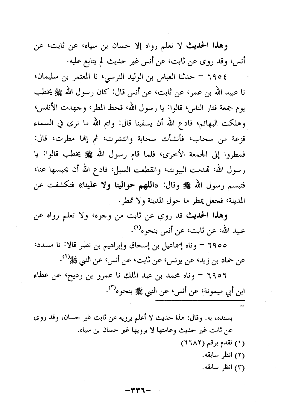 6954- حَدَّثنا العباس بن الوليد النرسي، حَدَّثنا المعتمر بن سليمان، حَدَّثنا عُبَيد اللَّهِ بْنُ عُمَر، عَنْ ثابتٍ، عَن أَنَسٍ، قَالَ: كَانَ رَسُولُ اللَّهِ صَلَّى اللَّهُ عَلَيه وَسَلَّم يَخْطُبُ يَوْمَ جُمُعَةٍ فَثَارَ النَّاسُ قالوا: يارسول اللَّهِ , قَحَطَ الْمَطَرُ , وَجَهِدَتِ الأَنْفُسُ , وَهَلَكَتِ الْبَهَائِمُ , فَادْعُ اللَّهَ أَنْ يَسْقِيَنَا , قَالَ: وَايْمُ اللَّهِ مَا نَرَى فِي السَّمَاءِ قَزَعَةً مِنْ سَحَابٍ , فَأَنْشَأَتْ سَحَابَةٌ , وَانْتَشَرَتْ، ثُمَّ إِنَّهَا مُطِرَتْ , قَالَ: فَمُطِرُوا إِلَى الْجُمُعَةِ الأُخرَى , فَلَمَّا قَامَ رَسُولُ اللَّهِ صَلَّى اللَّهُ عَلَيه وَسَلَّم يَخْطُبُ , قَالُوا: يارسول اللَّهِ تَهَدَّمَتِ الْبُيُوتُ , وَانْقَطَعَتِ السُّبُلُ , فَادْعُ اللَّهَ أَنْ يَحْبِسَهَا عَنَّا , فَتَبَسَّمَ رَسُولُ اللَّهِ صَلَّى اللَّهُ عَلَيه وَسَلَّم، وَقال: اللَّهُمَّ حَوَالَيْنَا، ولاَ عَلَيْنَا , فَتَكَشَّفَتْ عَنِ الْمَدِينَةِ , فَجَعَلَ يُمْطِرُ مَا حَوْلَ الْمَدِينةِ، ولاَ تُمْطِرُ.