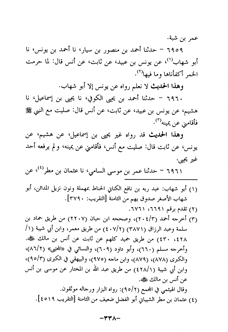 6959- حَدَّثنا أحمد بن منصور بن سيار، حَدَّثنا أحمد بن يُونُس، حَدَّثنا أَبُو شِهَابٍ , عَنْ يُونُس بْنِ عُبَيد، عَنْ ثابتٍ، عَن أَنَسٍ، قَالَ: لَمَّا حُرِّمَتِ الْخَمْرُ أَكْفَأْنَاهَا وَمَا فِيهَا.