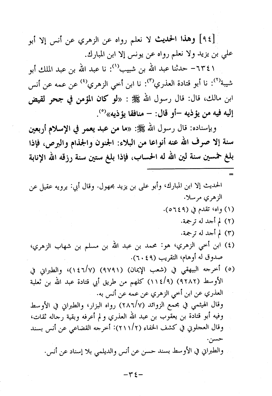 6341- حَدَّثنا عبد الله بن شبيب، حَدَّثنا عَبْدُ اللَّهِ بْنُ عَبْدِ الْمَلِكِ أَبُو شَيْبَةَ، حَدَّثنا أَبُو قتادة العذري، حَدَّثنا ابْنُ أَخِي الزُّهْرِيّ , عَن عَمِّهِ، عَن أَنَس بْنِ مَالِكٍ قَالَ: قَالَ رَسُولُ اللَّهِ صَلَّى اللَّهُ عَلَيْهِ وَسَلَّمَ: لَوْ كَانَ الْمُؤْمِنُ فِي جحر لقيض إليه فِيهِ مَنْ يُؤْذِيهِ، أَوْ قَالَ: مُنَافِقًا يُؤْذِيهِ.