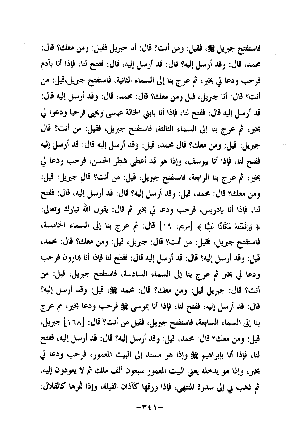 فَفُتِحَ لَنَا , فَإِذَا أَنَا بِمُوسَى صَلَّى اللَّهُ عَلَيه وَسَلَّم , فَرَحَّبَ وَدَعَا بِخَيْرٍ، ثُمَّ عَرَجَ بِنَا إِلَى السَّمَاءِ السَّابِعَةِ , فَاسْتَفْتَحَ جِبْرِيلُ , فَقِيلَ مَنْ أَنْتَ؟ قَالَ: جِبْرِيلُ، قِيلَ: وَمَنْ مَعَكَ، قَالَ: مُحَمَّدٌ، قِيلَ: وَقَدْ أُرْسِلَ إِلَيْهِ؟ قَالَ: قَدْ أُرْسِلَ إِلَيْهِ، فَفُتِحَ لَنَا , فَإِذَا أَنَا بِإِبْرَاهِيمَ صَلَّى اللَّهُ عَلَيه وَسَلَّم، وَإِذَا هُوَ مُسْنِدٌ إِلَى الْبَيْتِ الْمَعْمُورِ , فَرَحَّبَ وَدَعَا لِي بِخَيْرٍ، وَإِذَا هُوَ يَدْخُلُهُ، يَعْنِي الْبَيْتَ الْمَعْمُورَ سَبْعُونَ أَلْفَ مَلَكٍ، ثُمَّ لا يَعُودُونَ إِلَيْهِ، ثُمَّ ذَهَبَ بِي إِلَى سِدْرَةِ الْمُنْتَهَى , فَإِذَا وَرَقُهَا كَآذَانِ الْفِيَلَةِ، وَإِذَا ثَمَرُهَا كَالْقِلالِ , فَلَمَّا غَشِيَهَا مِنْ أَمْرِ اللَّهِ مَا غَشِيَ , تَغَيَّرَتْ , فَمَا أَحَدٌ مِنْ خَلْقِ اللَّهِ يَسْتَطِيعُ أَنْ يَنْعِتَهَا مِنْ حُسْنِهَا , فَأَوْحَى إليَّ مَا أَوْحَى , وَفَرَضَ عَلَيَّ فِي كُلِّ يَوْمٍ وَلَيْلَةٍ خَمْسِينَ صَلاةً.