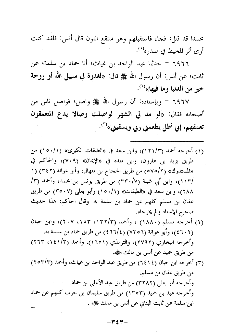 6966- حَدَّثنا عبد الواحد بن غياث , أخبرنا حَمَّادِ بْنِ سَلَمَةَ، عَنْ ثابتٍ، عَن أَنَس؛ أَن رَسولَ اللهِ صَلَّى اللَّهُ عَلَيه وَسَلَّم قَالَ: لَغَدْوَةٌ فِي سَبِيلِ اللَّهِ، أَوْ رَوْحَةٌ خَيْرٌ مِنَ الدُّنْيَا وَمَا فِيهَا.