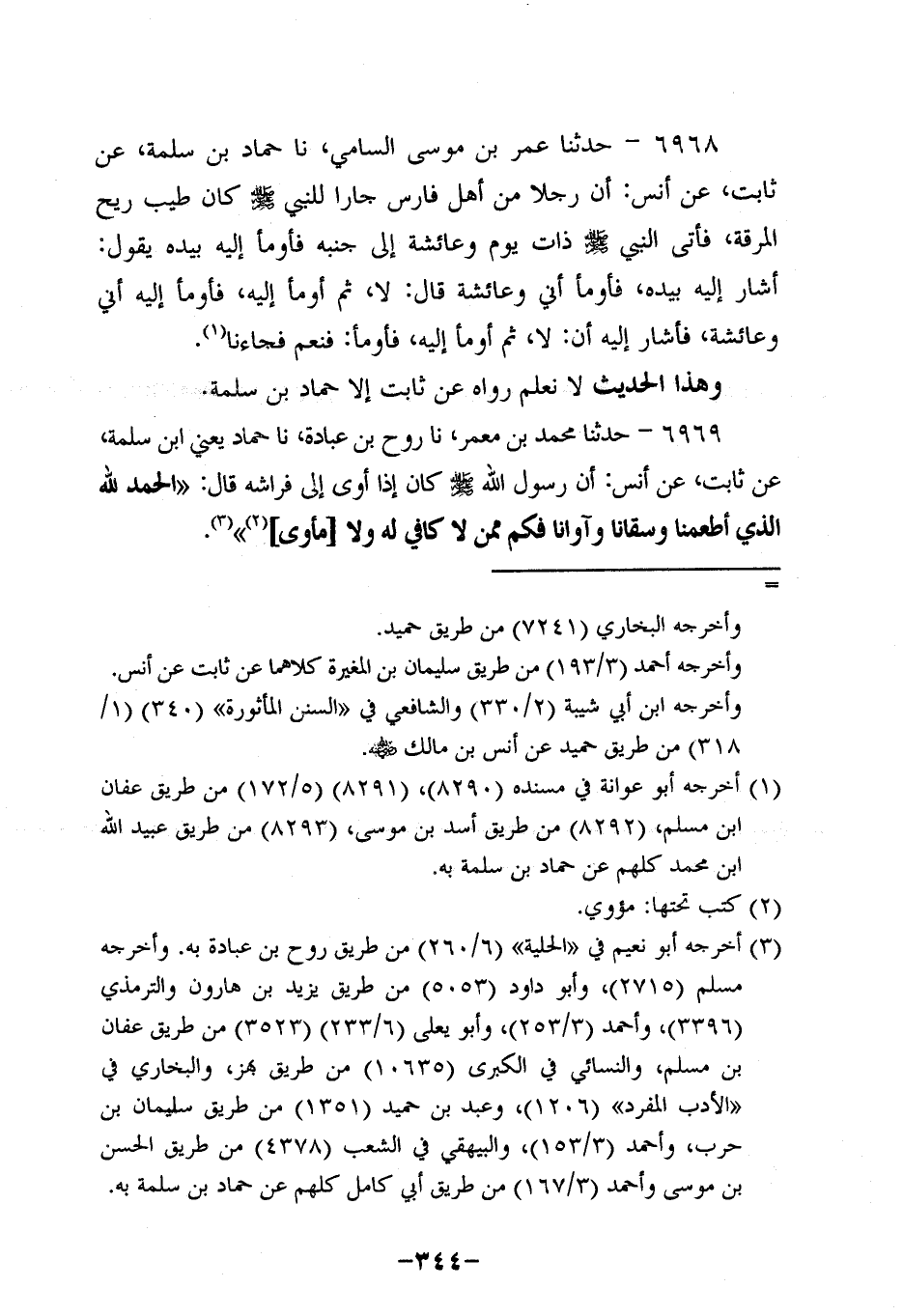 6969- حَدَّثنا محمد بن مَعْمَر، حَدَّثنا روح بن عبادة، حَدَّثنا حَمَّادٌ، يَعْنِي ابْنَ سَلَمَةَ، عَنْ ثابتٍ، عَن أَنَس؛ أَن رَسولَ اللهِ صَلَّى اللَّهُ عَلَيه وَسَلَّم كَانَ إِذَا أَوَى إِلَى فِرَاشِهِ قَالَ: الْحَمْدُ لِلَّهِ الَّذِي أَطْعَمَنَا وَسَقَانَا وَآوَانَا فَكَمْ ممن لا كافي له، ولاَ مأوى.