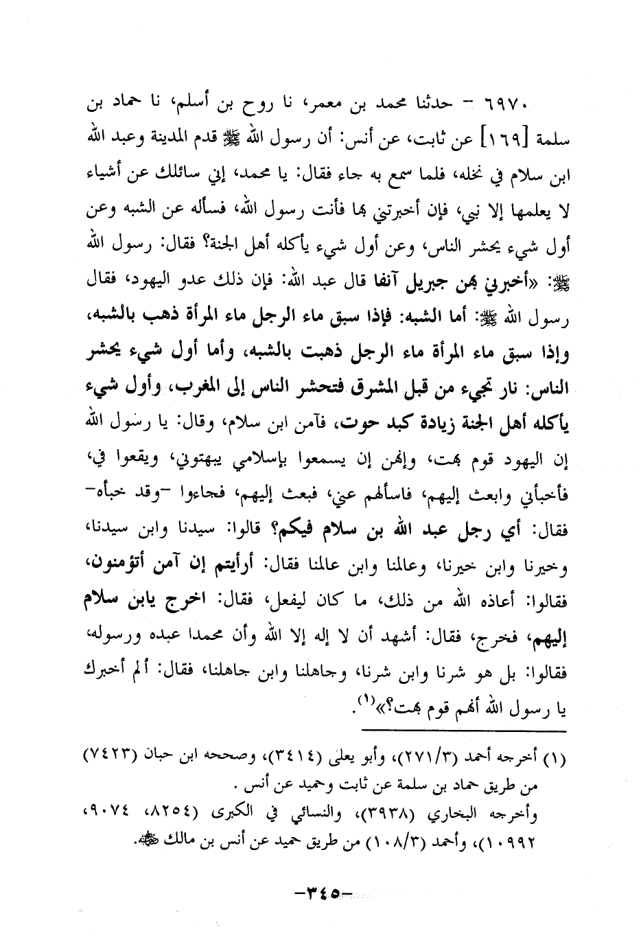 6970- حَدَّثنا محمد بن مَعْمَر، حَدَّثنا روح بن أسلم، حَدَّثنا حَمَّادِ بْنِ سَلَمَةَ، عَنْ ثابتٍ، عَن أَنَس؛ أَن رَسولَ اللهِ صَلَّى اللَّهُ عَلَيه وَسَلَّم قَدِمَ الْمَدِينَةَ وَعَبْدُ اللَّهِ بْنُ سَلامٍ فِي نخله , فلما سمع به جاء فقال: يامحمد، إِنِّي سَائِلُكَ عَنْ أَشْيَاءَ لَا يَعْلَمُهَا إلاَّ نَبِيٌّ , فَإِنْ أَخْبَرْتَنِي بِهَا , فَأَنْتَ رَسُولُ اللَّهِ , فَسَأَلَهُ عَنِ الشَّبَهِ , وَعَنْ أَوَّلِ شَيْءٍ يَحْشُرُ النَّاسَ , وَعَنْ أَوَّلِ شَيْءٍ يَأْكُلُهُ أَهْلُ الْجَنَّةِ؟ فَقَالَ رَسُولُ اللَّهِ صَلَّى اللَّهُ عَلَيه وَسَلَّم: أَخْبَرَنِي بِهِنَّ جِبْرِيلُ آنِفًا , قَالَ عَبْدُ اللَّهِ: فَإِنَّ ذَلِكَ عَدُوُّ الْيَهُودِ، فَقَالَ رَسُولُ اللَّهِ صَلَّى اللَّهُ عَلَيه وَسَلَّم: أَمَّا الشَّبَهُ: فَإِذَا سَبَقَ ماءُ الرجلِ ماءَ المرأةِ ذَهَبَ بِالشَّبَهِ، وَإِذَا سَبَقَ ماءُ المرأةِ ماءَ الرجلِ ذَهَبَتْ بالشبه.