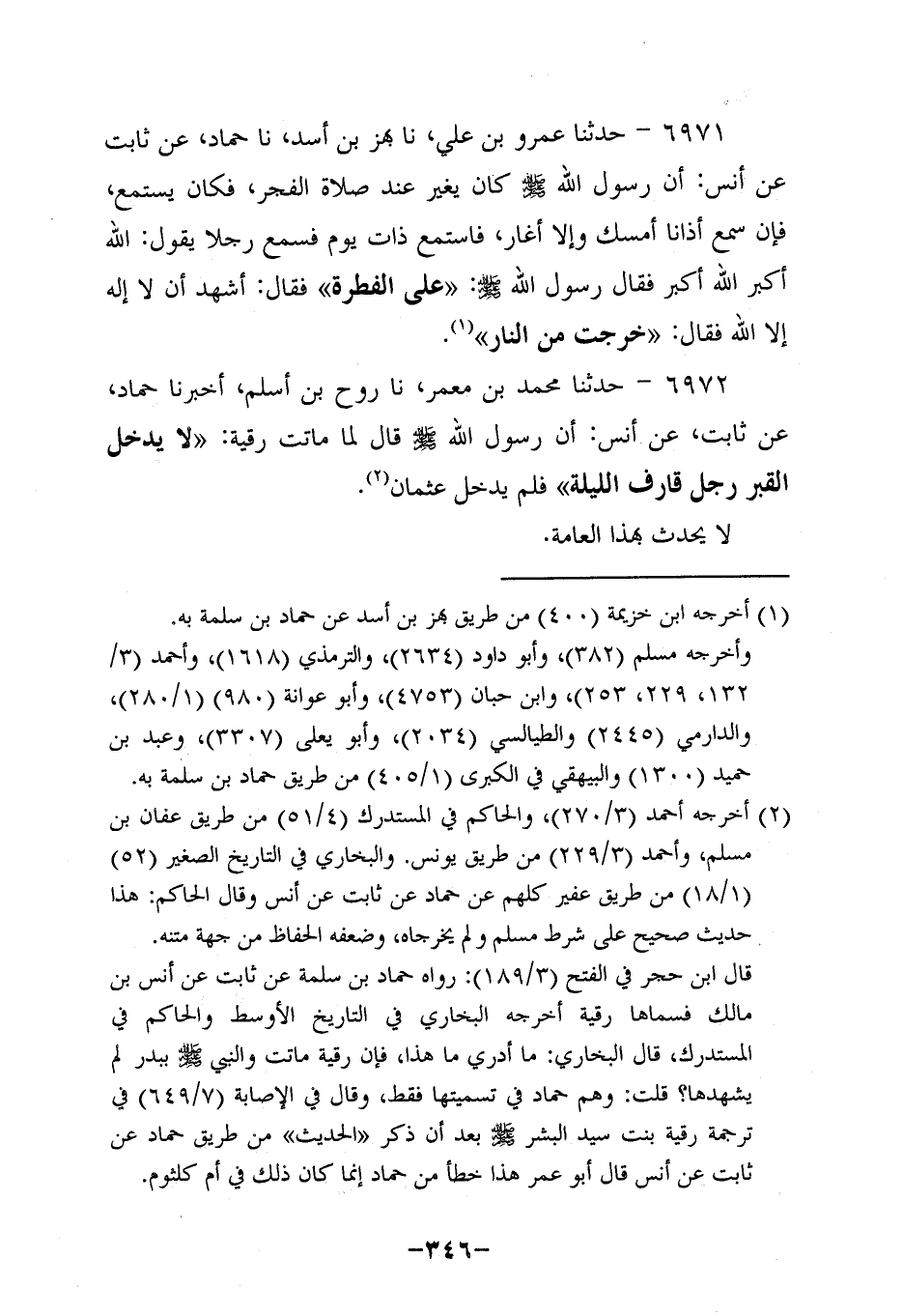 6971- حَدَّثَنا عَمْرُو بْنُ عَلِيٍّ، حَدَّثنا بهز بن أسد، حَدَّثنا حَمَّادٌ، عَنْ ثابتٍ، عَن أَنَس؛ أَن رَسولَ اللهِ صَلَّى اللَّهُ عَلَيه وَسَلَّم كَانَ يُغِيرُ عِنْدَ صَلاةِ الْفَجْرِ , فَكَانَ يَسْتَمِعُ , فَإِنْ سَمِعَ أَذَانًا أَمْسَكَ , وَإِلَّا أَغَارَ , فَاسْتَمَعَ ذَاتَ يَوْمٍ , فَسَمِعَ رَجُلا يَقُولُ: اللَّهُ أَكْبَرُ اللَّهُ أَكْبَرُ , فَقَالَ رَسُولُ اللَّهِ صَلَّى اللَّهُ عَلَيه وَسَلَّم: عَلَى الْفِطْرَةِ , فَقَالَ: أَشْهَدُ أَنْ لَا إِلَهَ إلاَّ اللَّهُ , فَقَالَ: خَرَجْتَ مِنَ النَّارِ.