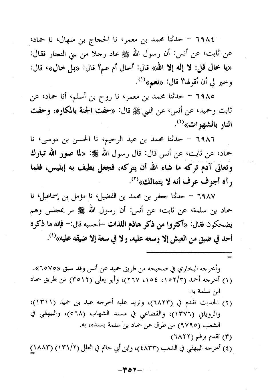 6987- حَدَّثنا جعفر بن محمد بن الفضيل، حَدَّثنا مُؤَمَّل بن إسماعيل، حَدَّثنا حَمَّادِ بْنِ سَلَمَةَ، عَنْ ثابتٍ، عَن أَنَس؛ أَن رَسولَ اللهِ صَلَّى اللَّهُ عَلَيه وَسَلَّم مَرَّ بِمَجْلِسٍ وَهُمْ يَضْحَكُونَ فَقَالَ: أَكْثِرُوا مِنْ ذِكْرِ هَاذِمِ اللَّذَّاتِ، أَحسَبُهُ قَالَ - فَإِنَّهُ مَا ذَكَرَهُ أَحَدٌ فِي ضِيقٍ مِنَ الْعَيْشِ إلاَّ وَسَّعَهُ عَلَيْهِ، ولاَ فِي سَعَةٍ إلاَّ ضَيَّقَهُ عَلَيْهِ.
