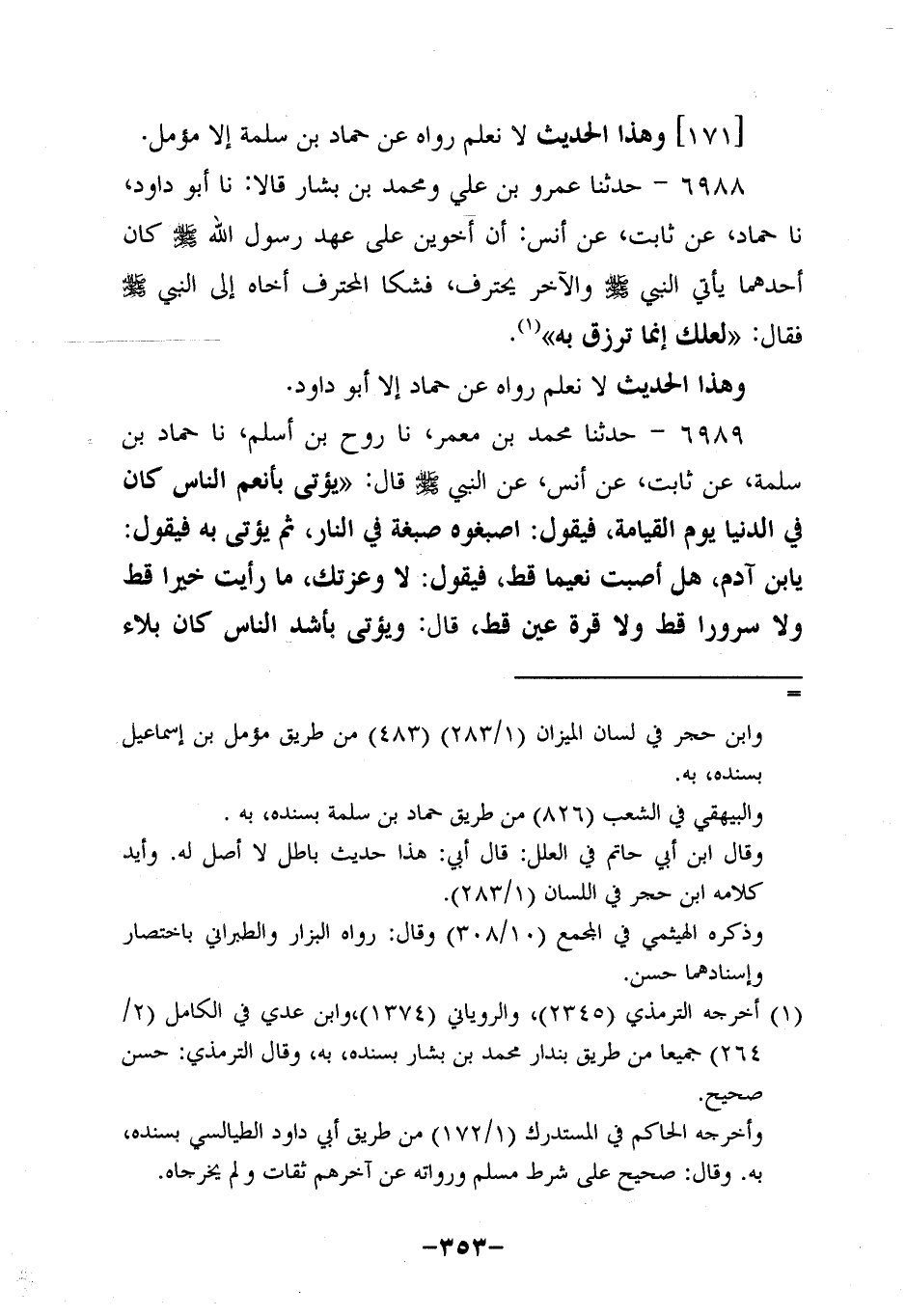 6988- حَدَّثَنا عَمْرُو بْنُ عَلِيٍّ، ومُحَمد بْنُ بَشَّارٍ، قَالاَ: حَدَّثنَا أَبُو داود، حَدَّثنا حَمَّادٌ، عَنْ ثابتٍ، عَن أَنَس؛ أَن أَخَوَيْنِ عَلَى عَهْدِ رَسُولِ اللَّهِ صَلَّى اللَّهُ عَلَيه وَسَلَّم كَانَ أَحَدُهُمَا يَأْتِي النَّبِيّ صَلَّى اللَّهُ عَلَيه وَسَلَّم وَالآخَرُ يَحْتَرِفُ فَشَكَا الْمُحْتَرِفُ أَخَاهُ إِلَى النَّبِيّ صَلَّى اللَّهُ عَلَيه وَسَلَّم فَقَالَ: لَعَلَّكَ إِنَّمَا تُرْزَقُ بِهِ.