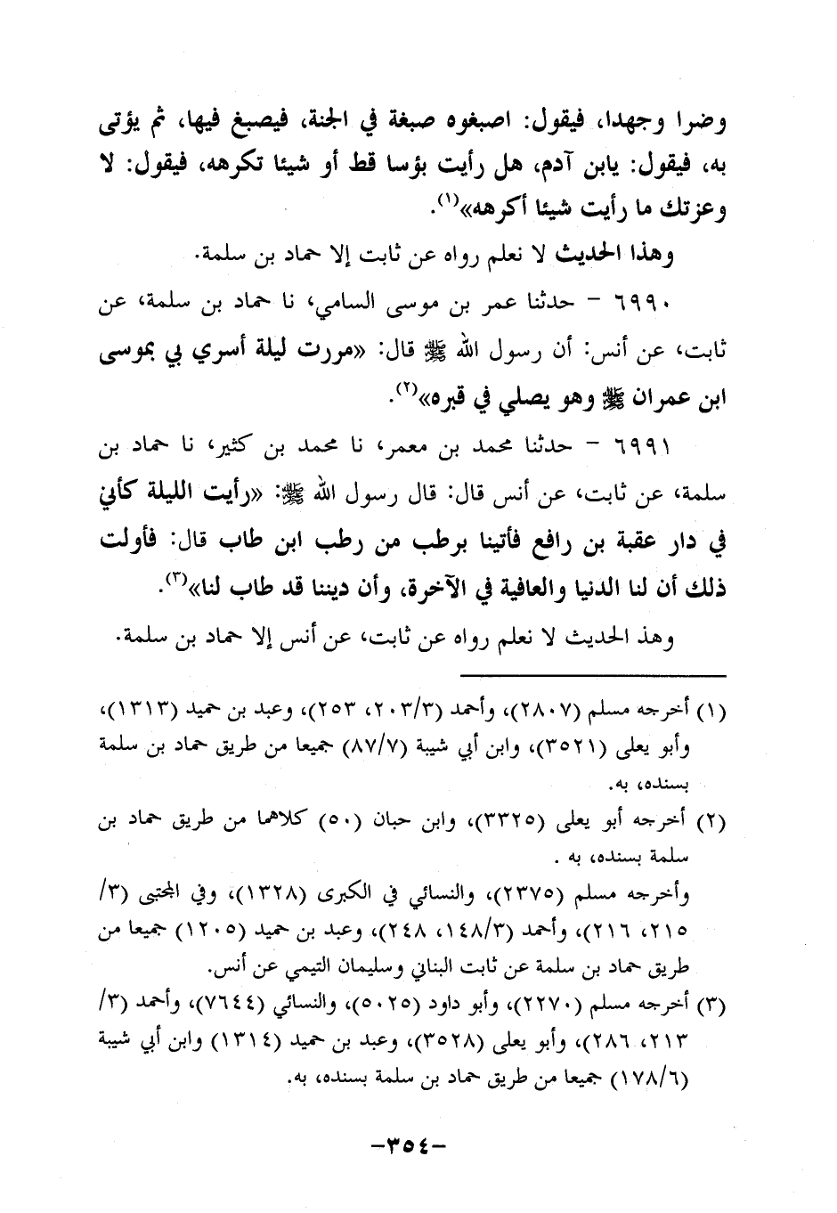 6990- حَدَّثنا عُمَر بن موسى السامي، حَدَّثنا حَمَّادِ بْنِ سَلَمَةَ، عَنْ ثابتٍ، عَن أَنَس؛ أَن رَسولَ اللهِ صَلَّى اللَّهُ عَلَيه وَسَلَّم قَالَ: مَرَرْتُ لَيْلَةَ أُسْرِيَ بِي بِمُوسَى بْنِ عِمْرَانَ صَلَّى اللَّهُ عَلَيه وَسَلَّم، وهُو يُصَلِّي في قبره.
